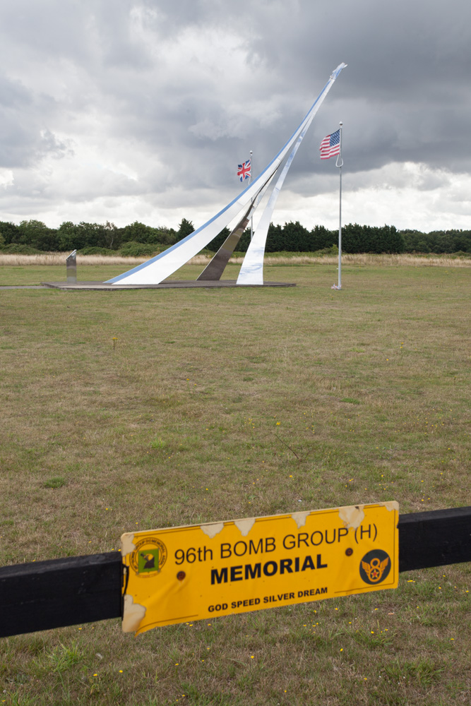 MonumentThe monument consists of four large silver triangular metal prongs that extend upward toward the sky to support a small model airplane. The prongs gradually become thinner are they extend. The monument rests on a concrete base that is connected to a sidewalk which leads from the road to the memorial. Behind the four prongs, there is a similar silver plaque that bears an English inscription honoring the 96th Bomb Group and its associated squadrons. The top of the plaque features the insignia of the squadrons as well as that of the 96th Bomb Group.