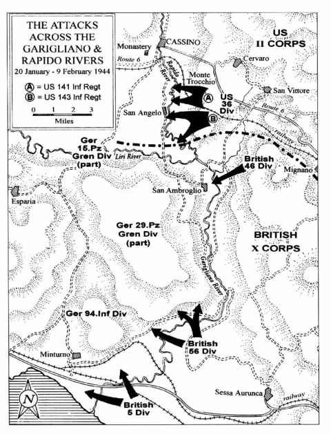 “The Rapido River, skirting Cassino, was the retaining band on the cork. Fifth Army elected to crack it by a frontal assault in an S-bend opposite Cassino. If ever the Germans were prepared to meet an attack, it was then and there. The 141st [Regiment]on the right and the 143rd [Regiment] on the left drove gallantly into the strongest defenses of the line, were thrown reeling back. Squads reformed from companies led by sergeants and launched another violent attack. Enemy mines were too thick; observation too good; machine guns firing almost from the rear, from the flanks and chopping down Yank assault elements. Attack after attack was ripped apart by the wicked cross-fire.