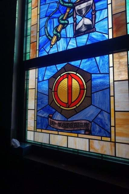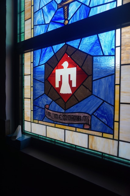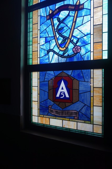 The Stain glassed windows include the Division symbol (Shoulder patch) with the words “In Memoriam” underneath the symbol.