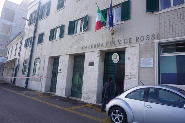 Located on the front of Caserma Fin. V. Di Rossi (Guardia di Finanza) building about 8 feet off the ground.