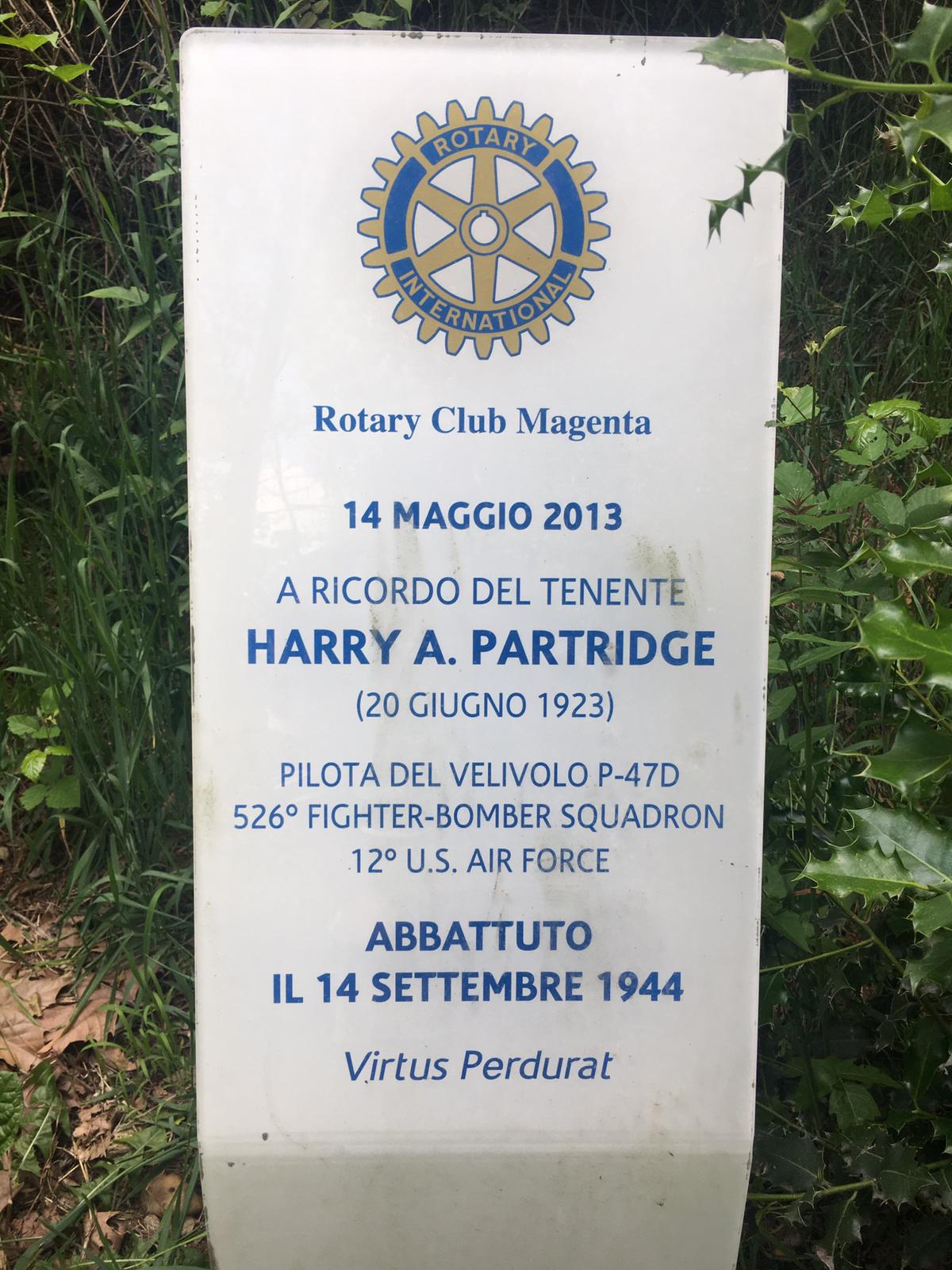 The Rotary Club -Magenta, placed the marker at the crash site location to remember the sacrifice of Second Lieutenant Harry A, Partridge when he was killed in the skies over Boffalora on September 14, 1944. The town of Boffalora and the Rotary Club-Magenta also placed a memorial plaque where Partridge was interred in the cemetery of Boffalora until being repatriated to the US in the late 1940s.