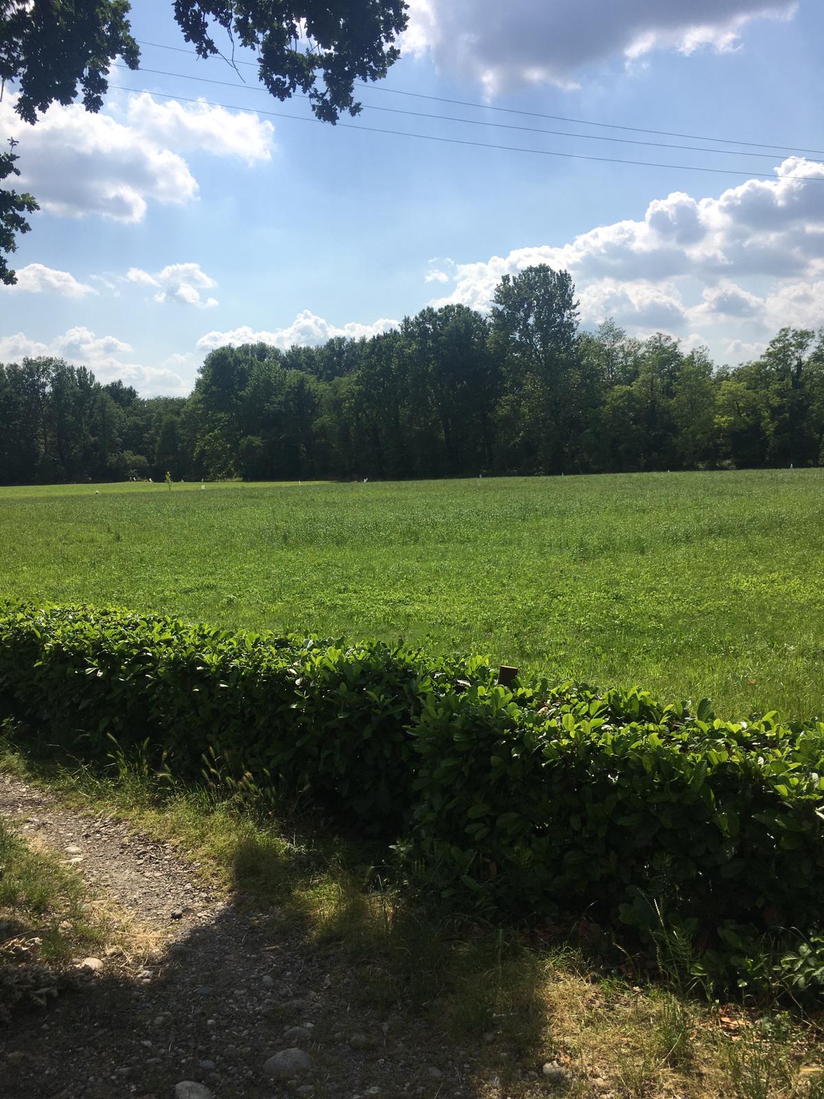 Off road adjacent to a tree line in an open field.
