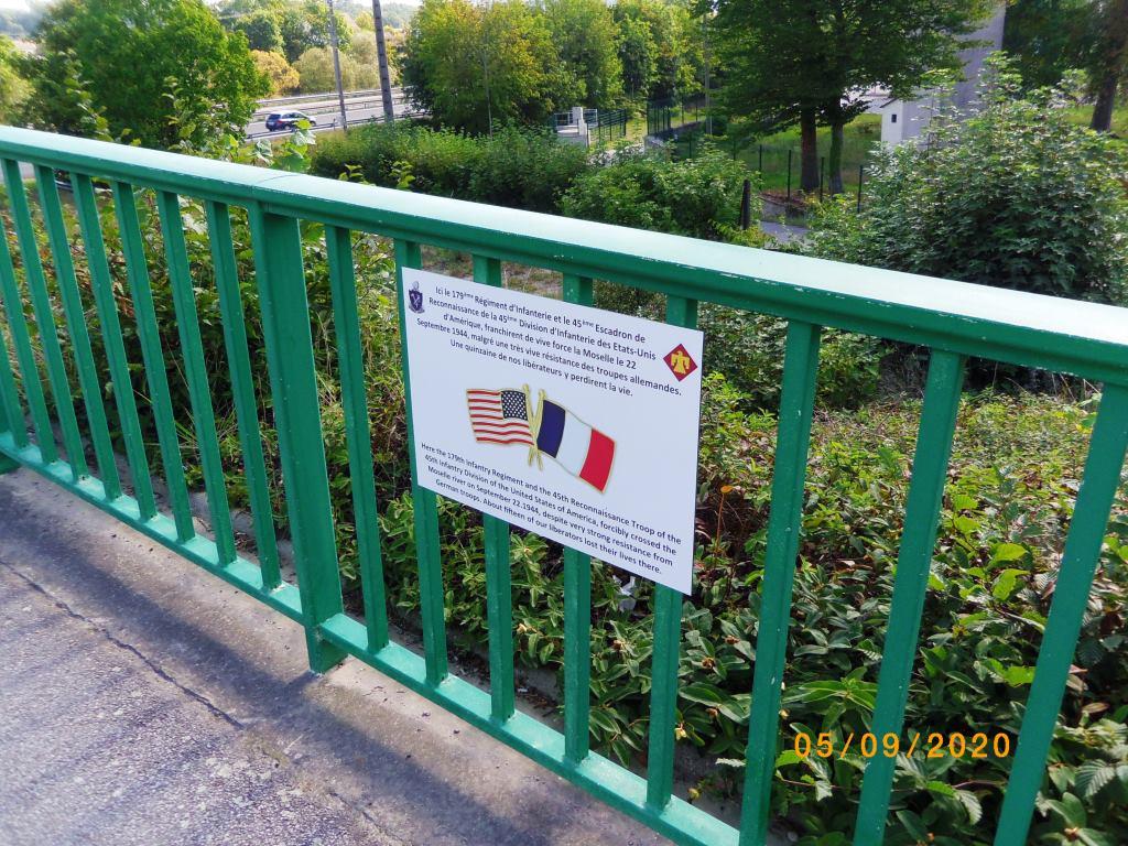 The plaque is attached on the guardrail on the east side of the bridge. Plaque A rectangular white plaque, inscribed in English and French text, incised in black lettering. The insignia of the 179th Infantry Regiment is printed on the top-left while the 45th Reconnaissance Troop’s insignia is on the top-right. The crossed flags of the US and France are printed in colors on the center. The plaque commemorates the crossing of the two units on the Moselle River in September 1944.
