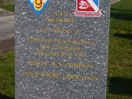 In memory of the men of the 323rd Group, 9th US air force based in Samoussy from October 1944 to February 1945. They died in battle for our freedom.