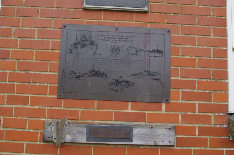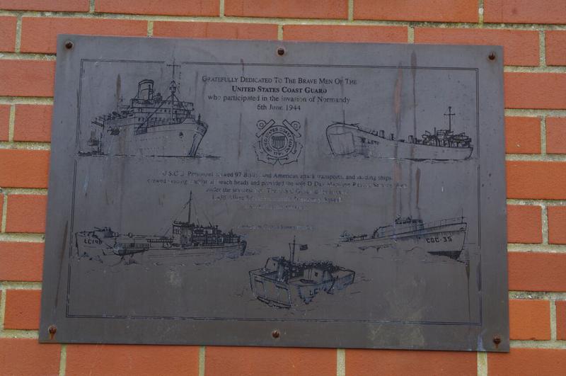 A stainless steel plaque inscribed in English text incised in black lettering with 5 various ship images of the US Coast Guard. The plaque commemorates the contribution made by members of the United States Coast Guard in the D-Day operations. An additional plaque which was installed in 1995 and is placed below the main plaque.