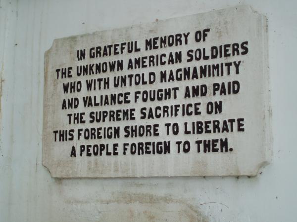 In grateful memory of the unknown American soldiers who with untold magnanimity and valiance fought and paid the supreme sacrifice on this foreign shore to liberate a people foreign to them.