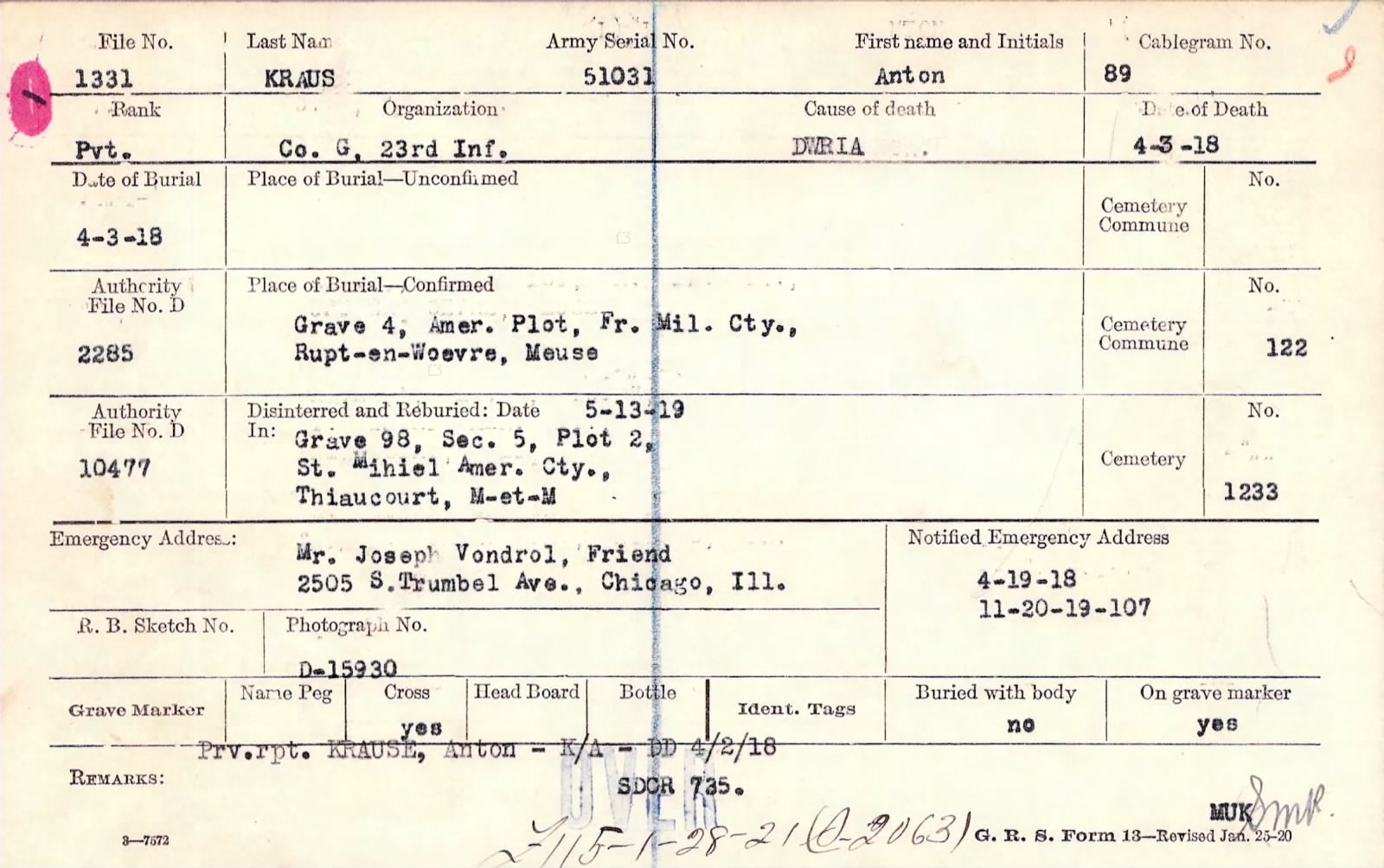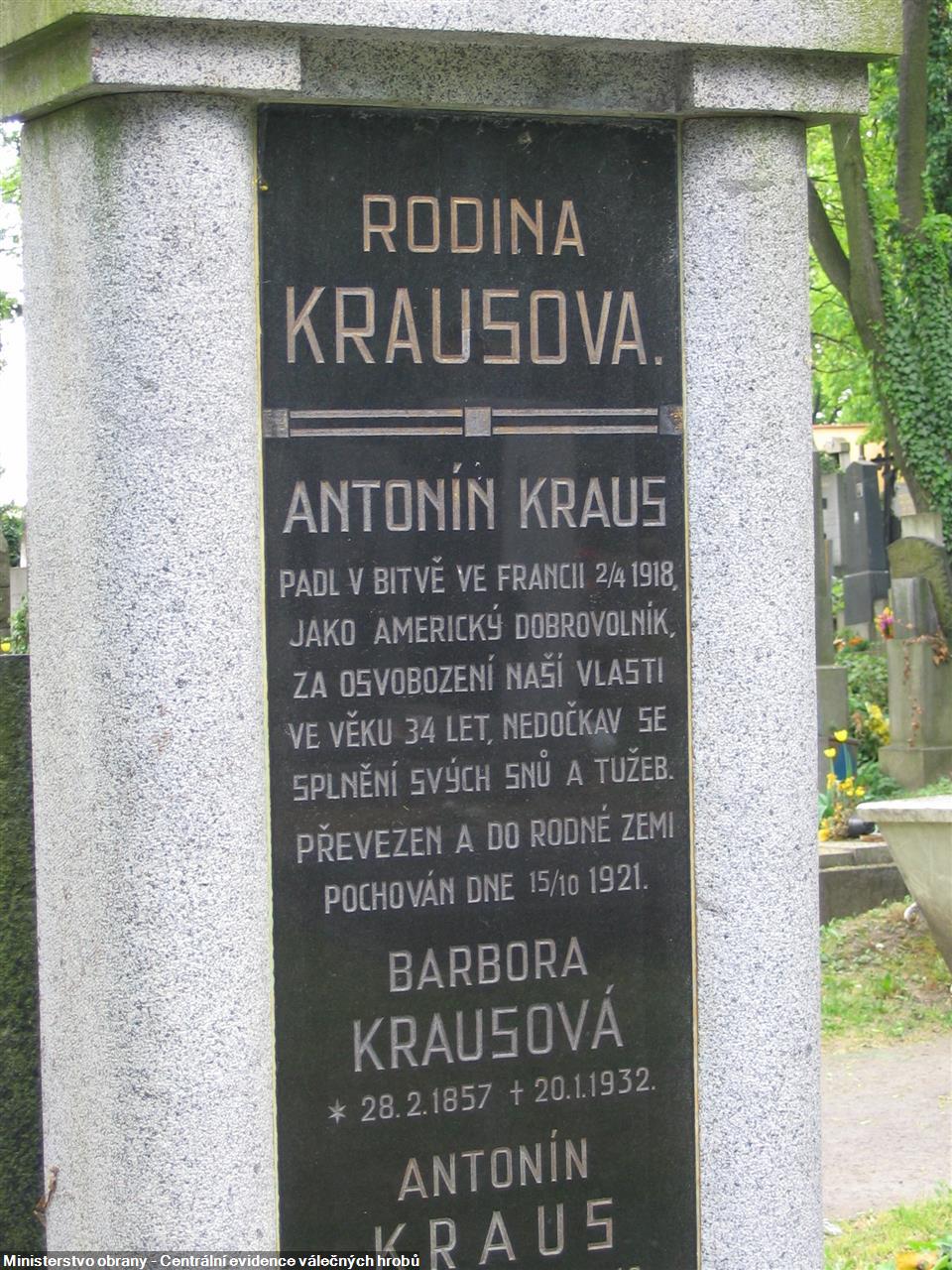 Private Anton Kraus (born, Antonin Kraus; US Military also referred to as Krause) was born on July 16, 1884 in the present day Czech Republic. He immigrated to the US and lived in Chicago Illinois. He enlisted in the US Army in 1917 and served with Company G, 23rd Infantry Regiment, 2nd Infantry Division in France during World War 1. He died of wounds received in battle on April 2, 1918 (Also reported as April 3, 1918). The 23rd Infantry Regiment was involved in combat in the Verdun sector in March 1918 where Kraus mostly liked suffered his wounds.