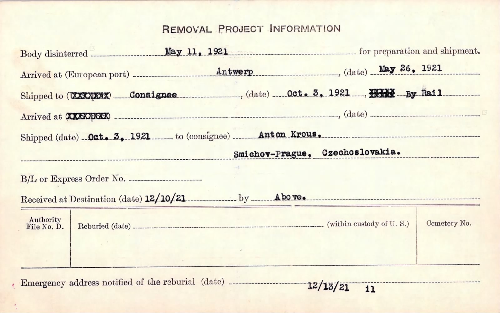 He was temporarily buried after death and then transferred to the US St. Mihiel Cemetery in 1919. At the request of his family, he was transferred to his Prague, Czech Republic Malvazinky cemetery and was buried on October 15, 1921.