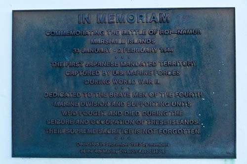 The plaque remembers the 4th Marine Division landing on Roi and Namur Islands during the Battle of Kwajalein in February 1944. The 4th Marine Division landed on Roi and Namur Islands on the northern side of the Kwajalein Atoll in the Marshall Islands as part of Operation Flintlock during the Eastern Mandate Campaign.