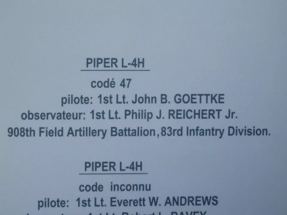PIPER L-4H code 47 pilot: 1st Lt. John B. GOETTKE observer: 1st Lt. Philip J. REICHERT Jr. 908th Field Artillery Battalion, 83rd Infantry Division.