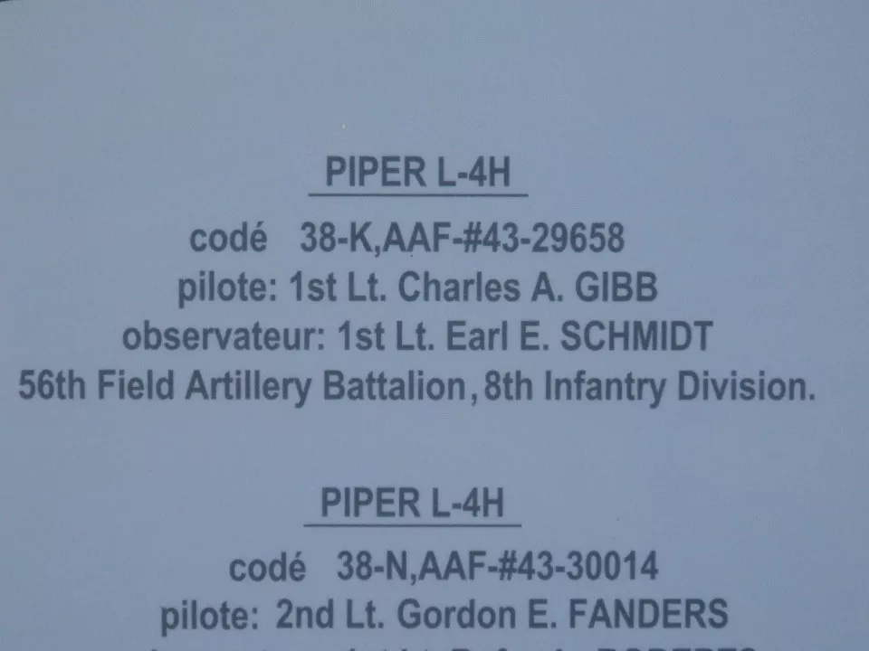 PIPER L-4H codé 38-N,AAF-#43-30014 pilote: 2nd Lt. Gordon E. FANDERS observateur: 1st Lt. Rufus L. ROBERTS 56th Field Artillery Battalion, 8th Infantry Division. |