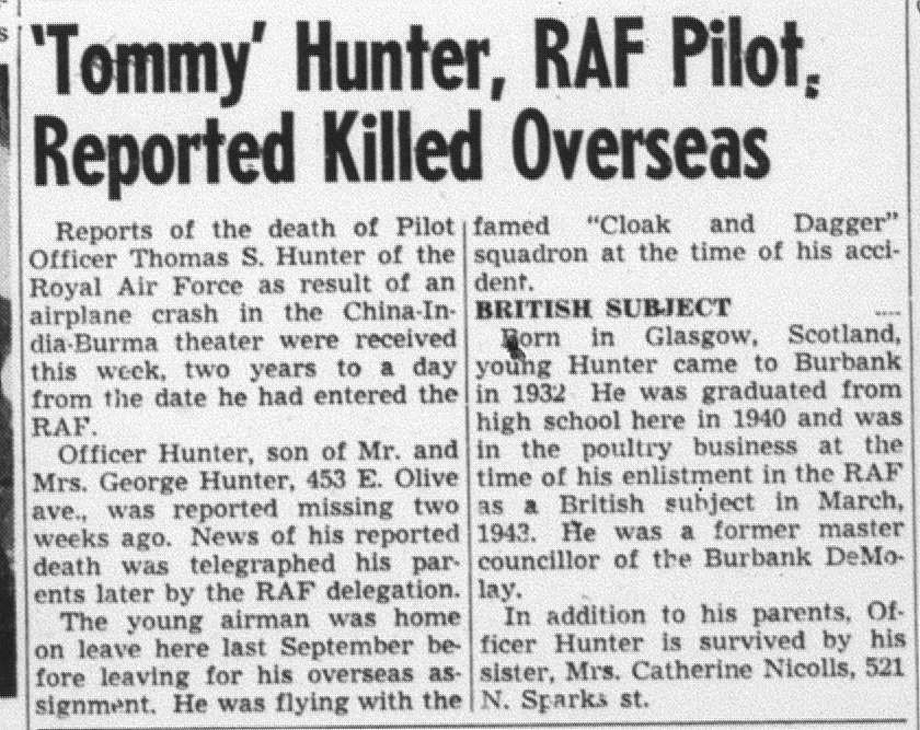 Flight Officer Hunter was born in Scotland, but grew up in Burbank, California. He enlisted in the Royal Air Force in World War 2 and flew with the "Cloak and Dagger" 357th Squadron in the China Theater of operations.