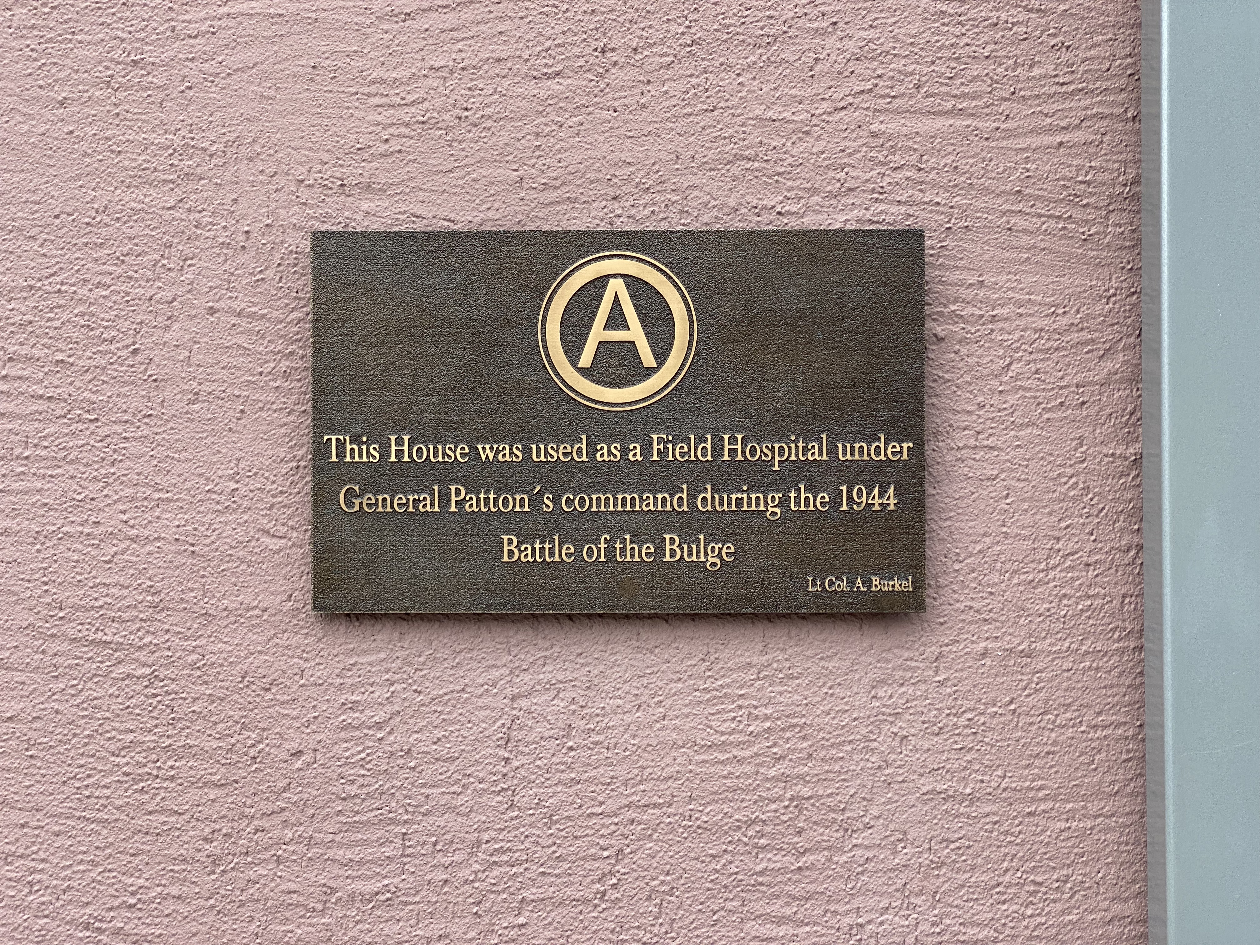 Plaque reads: "This House was used as a Field Hospital under General Patton's command during the 1944 Battle of the Bulge"