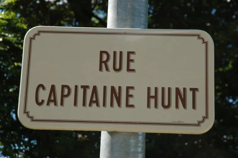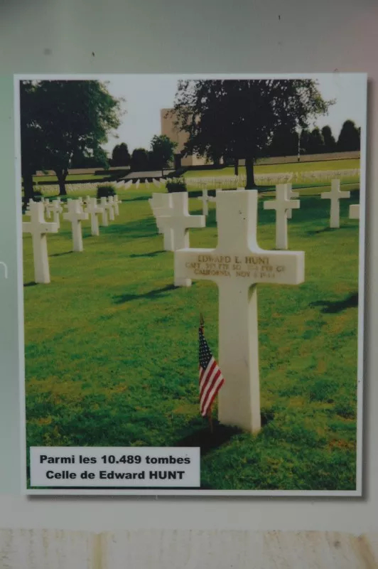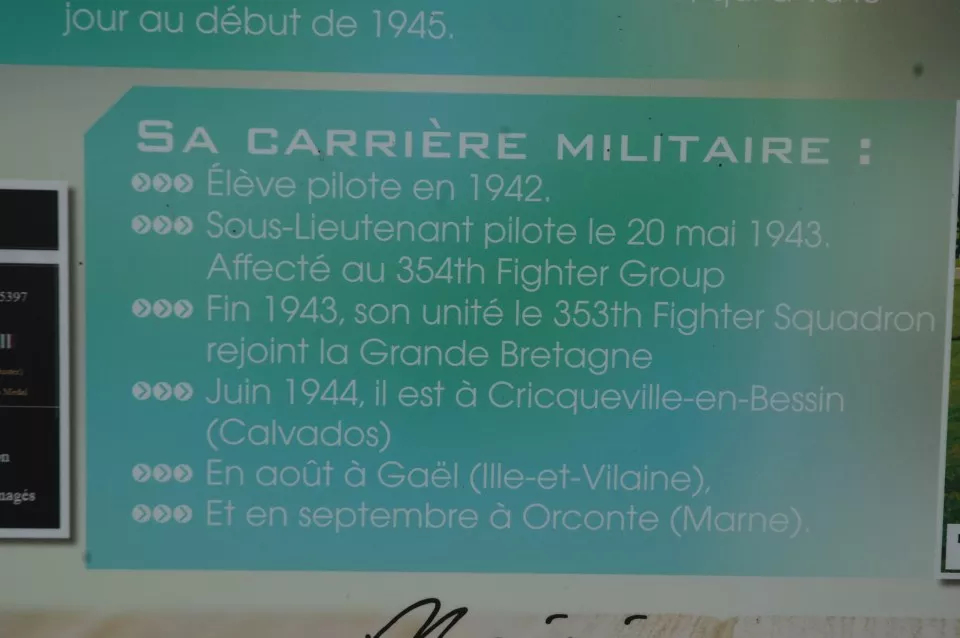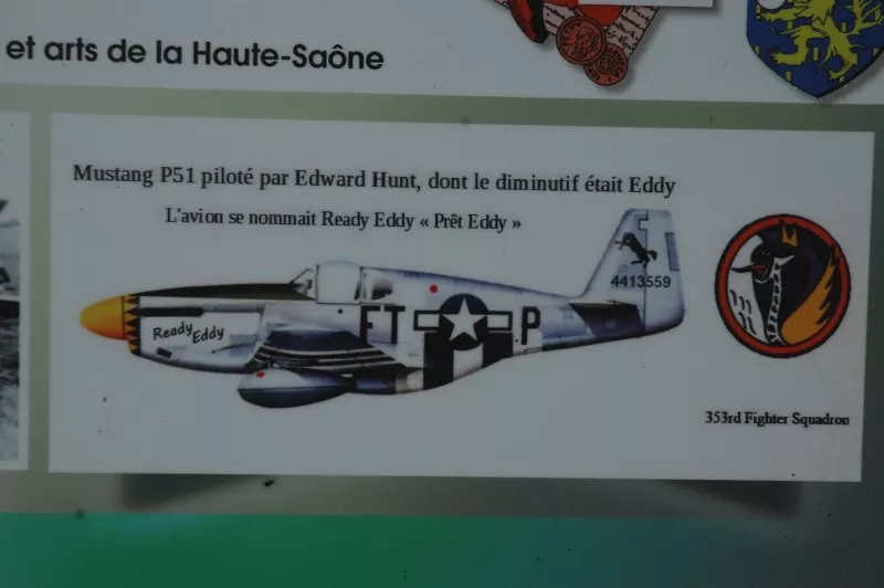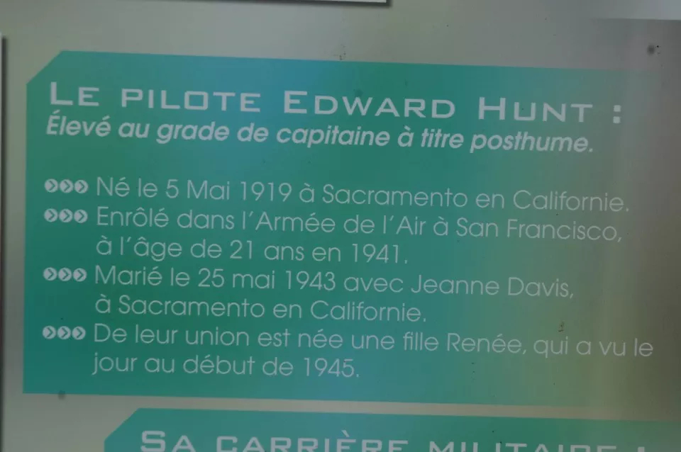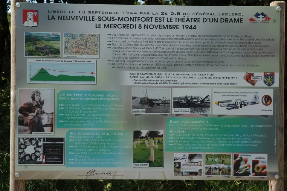 A rectangular metal panel telling the crash and fate of Cpt Hunt on November 8, 1944. The panel also includes his military background as well as several various photos. The inscription is written in French.