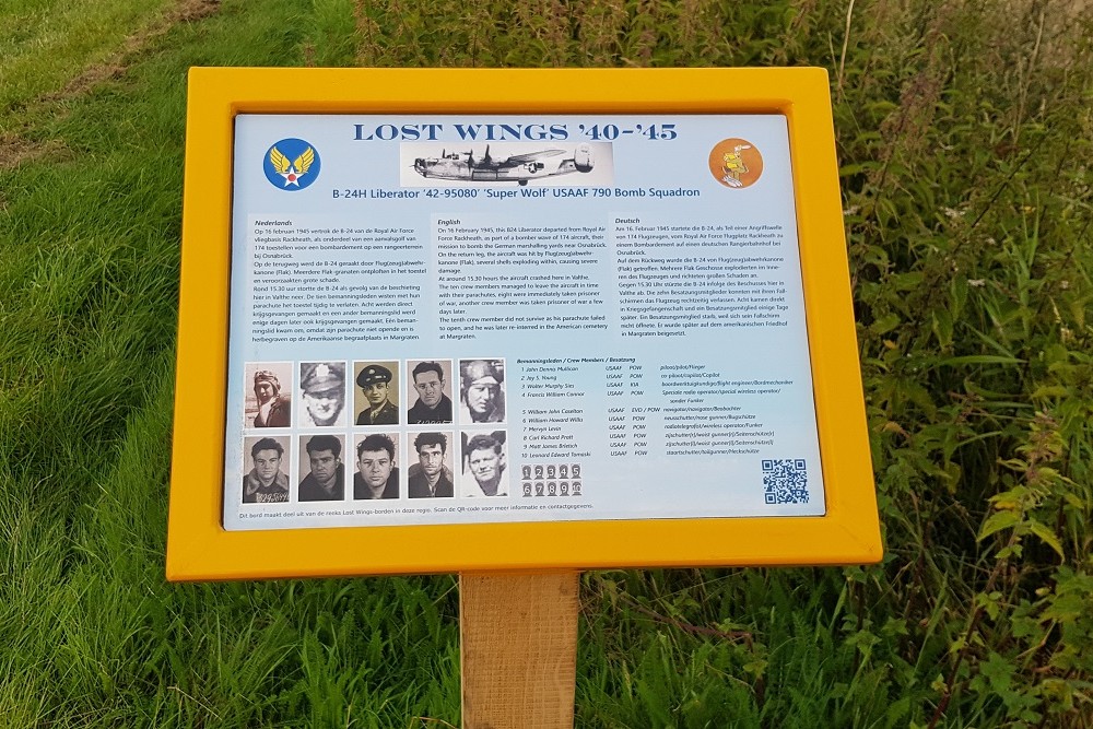A rectangular board, written in 3 languages, containing the history of the crash and crew of the aircraft. Included in the info sign are the photos of the crew members.