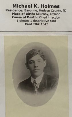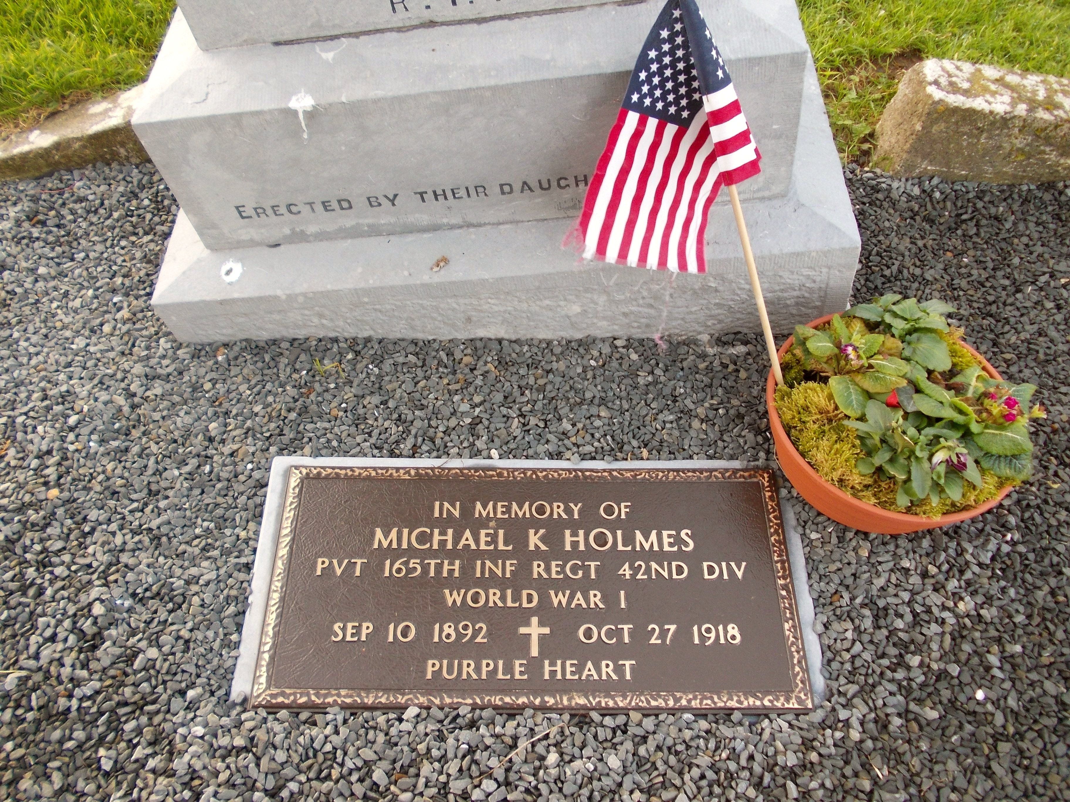 The cenotaph remembers Private Michael Kern Holmes an Irish born soldier who fell on October 27, 1918 in World War 1 in France while serving with the 165th Infantry Regiment (aka "Fighting 69th") of the 42nd Infantry "Rainbow" Division.