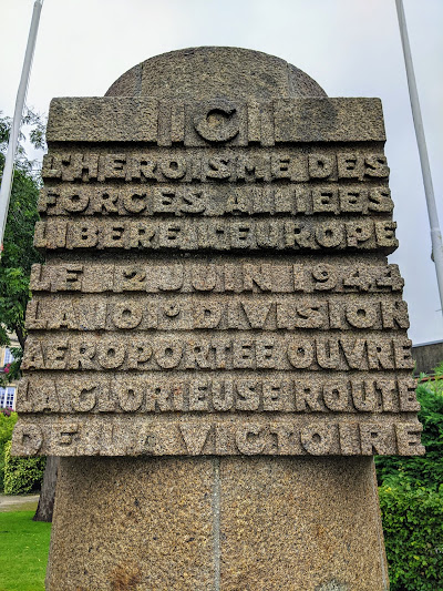A stone monument featuring an engraved commemorative message and a rectangular bronze plaque pays tribute to the 101st Airborne Division and other units involved in the town's liberation on June 12, 1944; the inscription is in French, while the plaque is in English. This monument is part of a series, including similar ones in Sainte-Mère-Église and at the northern end of Utah Beach, dedicated to honoring Allied contributions during the Normandy campaign.