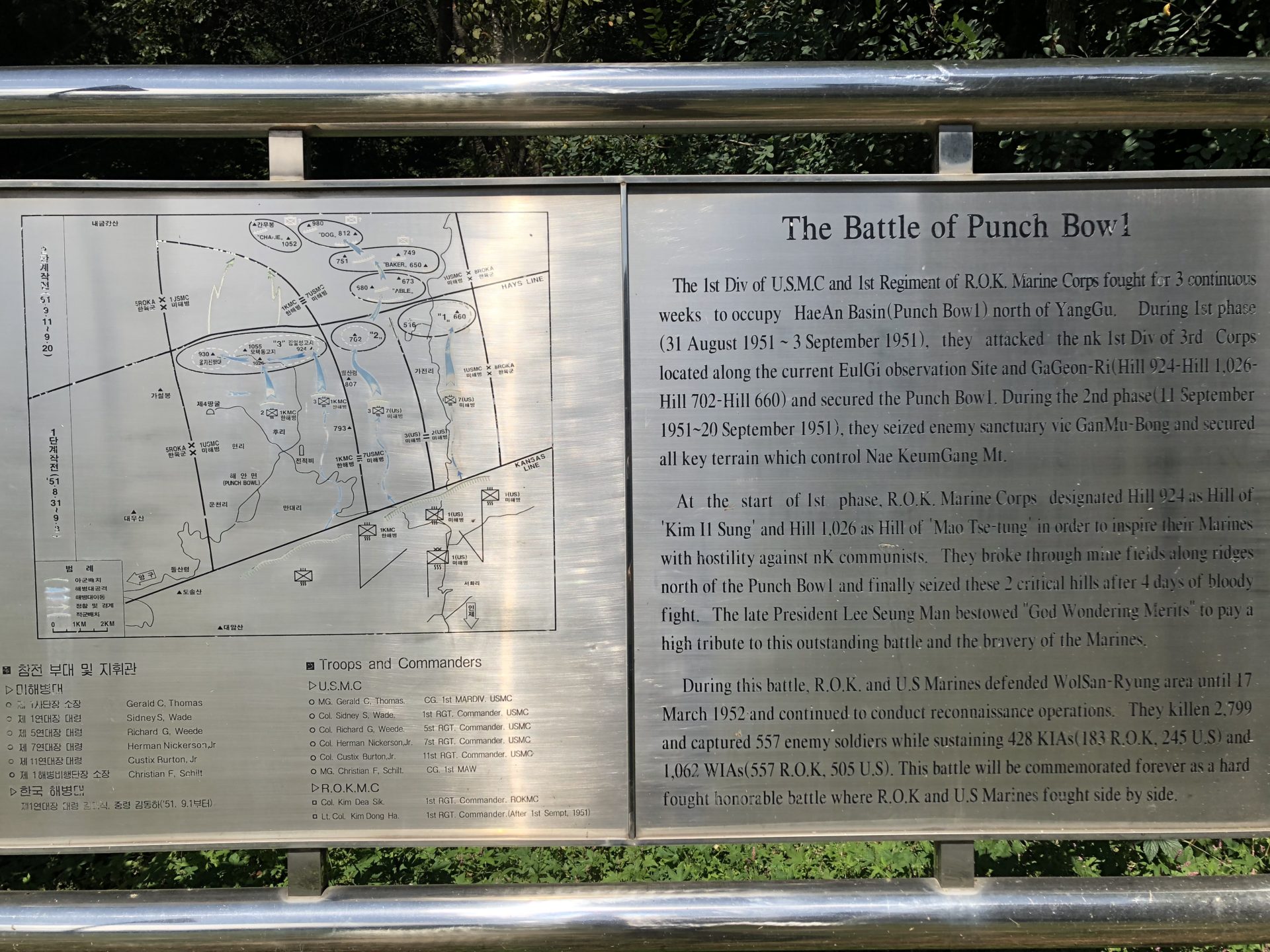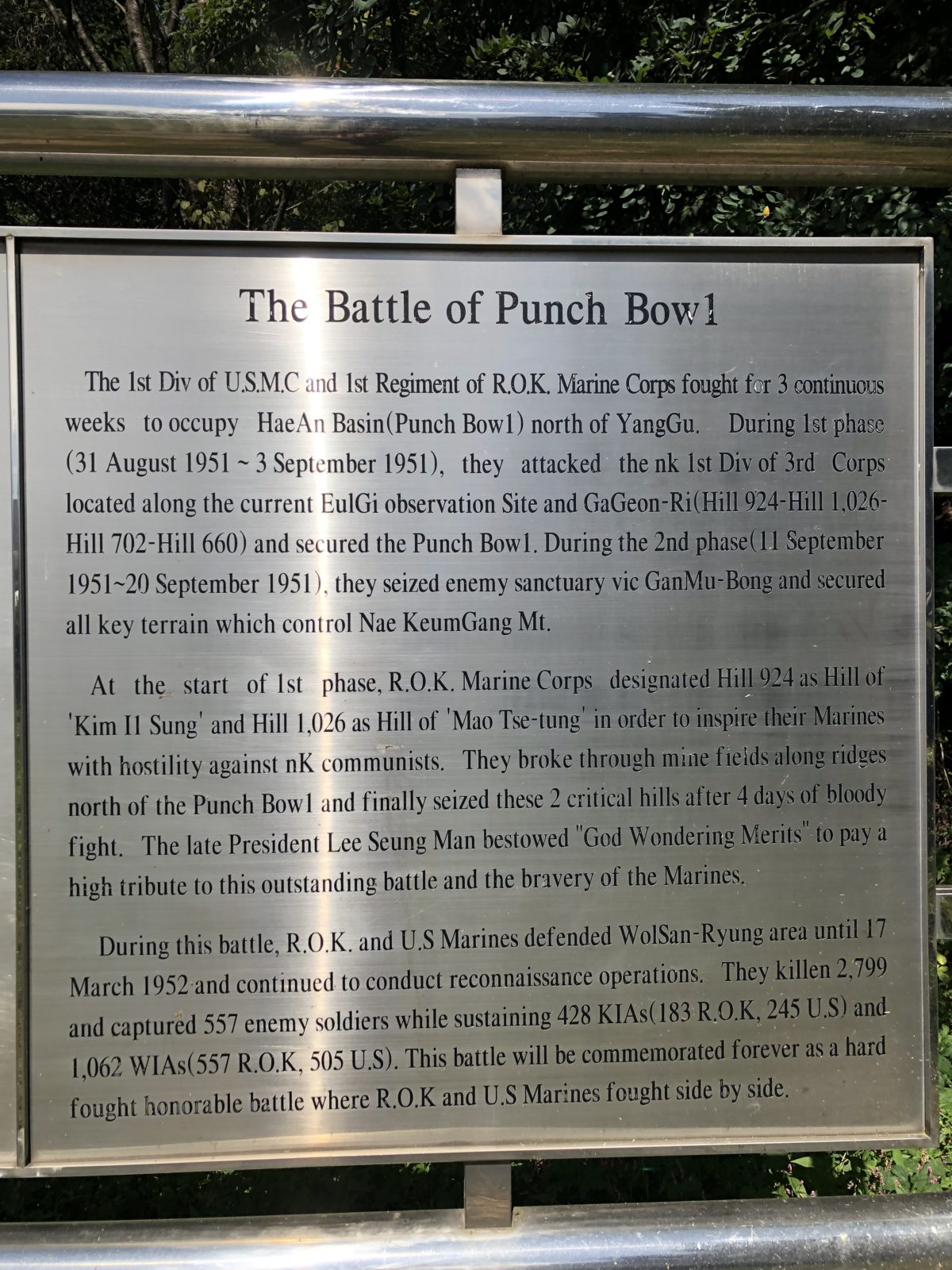 'Kim II Sung' and Hill 1,026 as Hill of 'Mao Tse-tung' in order to inspire their Marines with hostility against NK communists. They broke through mine fields along ridges north of the Punch Bowl and finally seized these 2 critical hills after 4 days of bloody fight. The late President Lee Seung Man bestowed "God Wondering Merits" to pay a high tribute to this outstanding battle and the bravery of the Marines.