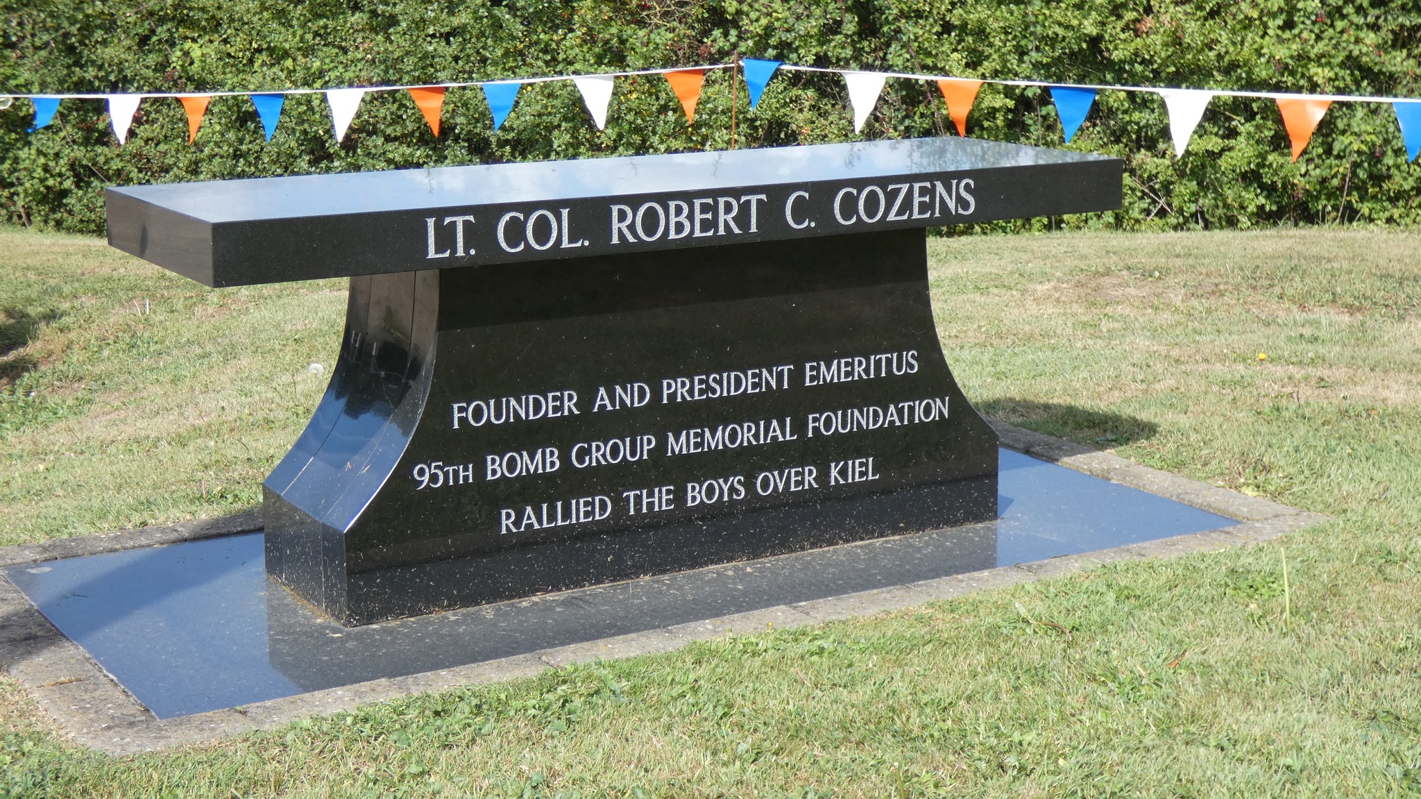 The bench rememebres the Commander fo the 95th Bomber Group - Lt Colonel Robert C. Cozens whoe lead the Group from April 1943 to April 1944 and the post-war 95th Bomber Group Assocation.