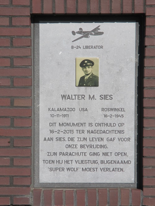 The memorial remember Sergeant Walter M. Sies who was the Flight Engineer on the B-24 (42-95080) 'Super Wolf' of the 790th Bomber Squadron, 467th Bomber Group, which was shot down nearby on February 16, 1945.
