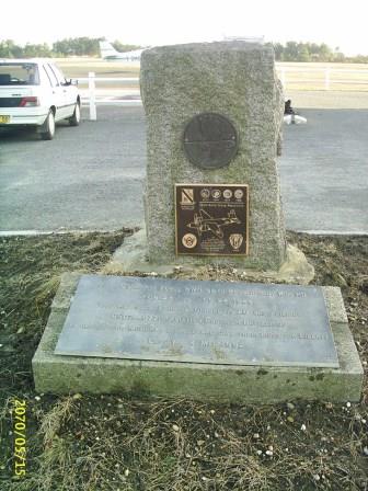 A vertical stone pillar bearing two bronze plaques commemorating Charles Lindbergh and the Bomb Groups that operated out of this airfield during WWII. A second silver, weather-beaten plaque commemorating the airfield's builders is laid out at its feet on a rectangular stone block.