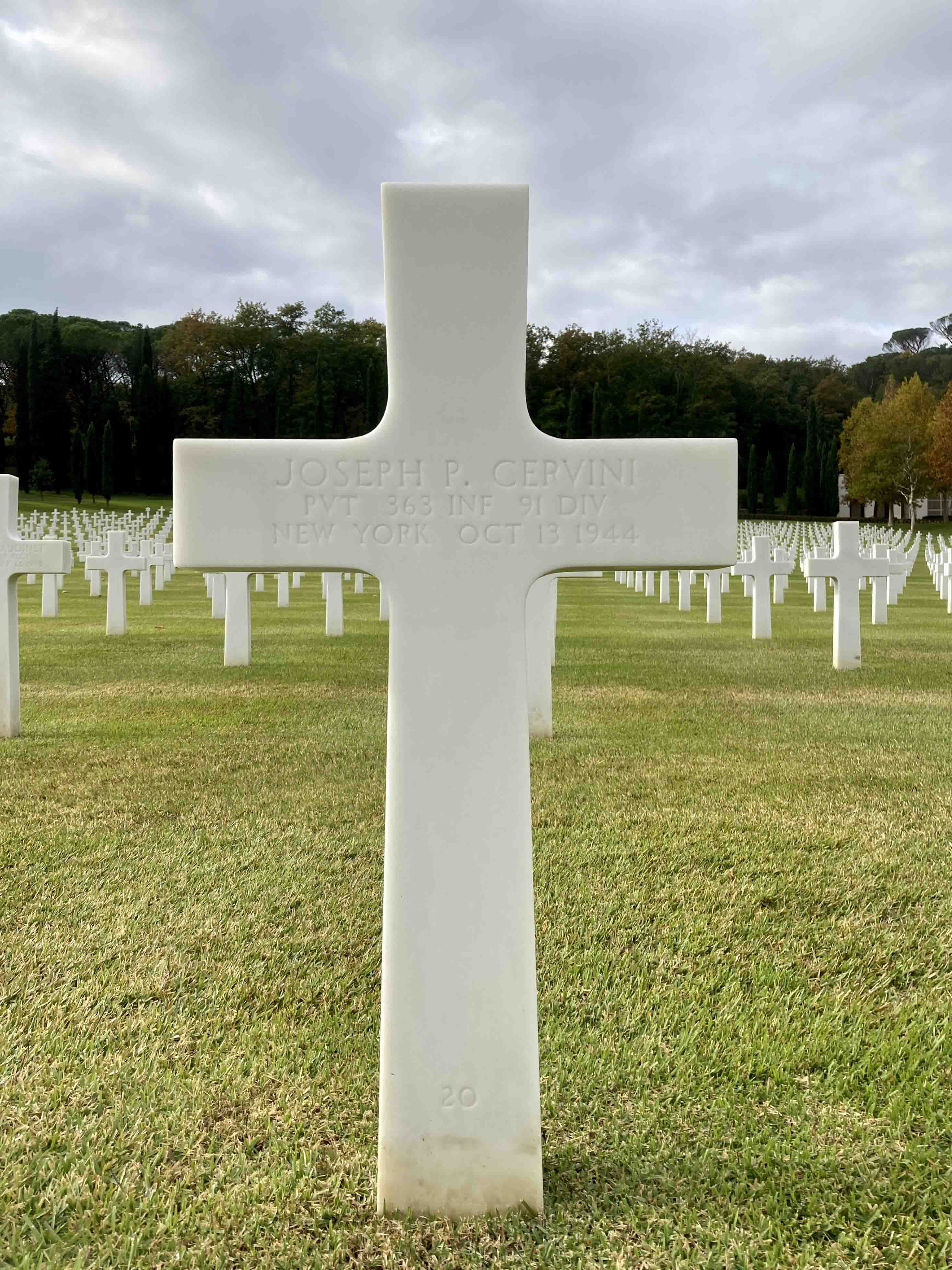 Joseph P. Cervini entered the military service in New York. He served in the 363rd Infantry, 91st Infantry Division as a Private during World War II. He died on October 13, 1944 and is now buried in the Florence American Cemetery, Impruneta, Italy.
