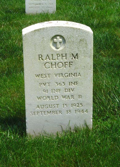 Ralph M. Choff, aged 19, was born on August 15, 1925. He served in the 363rd Infantry, 91st Infantry Division as a Private during World War II. Ralph died on September 18, 1944 in the battle around the area of Ponzalla in Italy and is now buried in the Grafton National Cemetery, Grafton, Taylor County, West Virginia, USA.