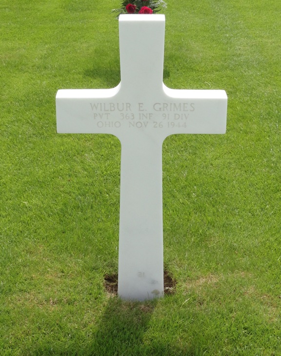 Wilbur E. Grimes, Jr., aged 19, was born on July 10, 1925 in Harrison County, Ohio. He served in the 363rd Infantry, 91st Infantry Division as a Private during World War II. Wilbur died on November 26, 1944 during the battle in the area of Ponzalla in Italy and is now buried in the Netherlands American Cemetery, Margraten, Netherlands. He also has a cenotaph located in Cadiz Union Cemetery, Cadiz, Harrison County, Ohio, USA.