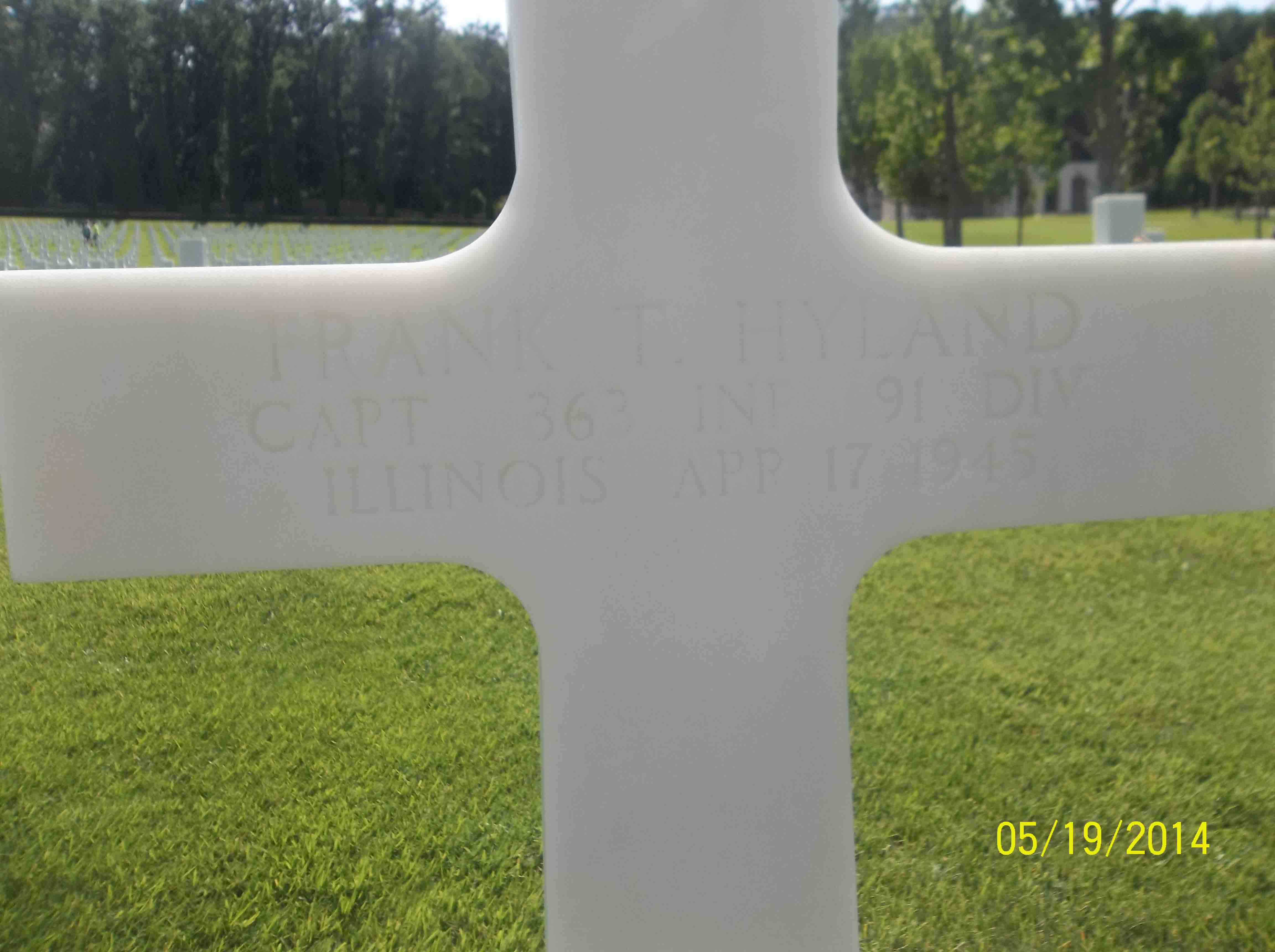 Frank T. Hyland entered the military service in Illinois. He served in the 363rd Infantry, 91st Infantry Division as a Captain during World War II. Frank died on April 17, 1945 during the battle in the area of Ponzalla in Italy and is now buried in the Florence American Cemetery, Impruneta, Italy.