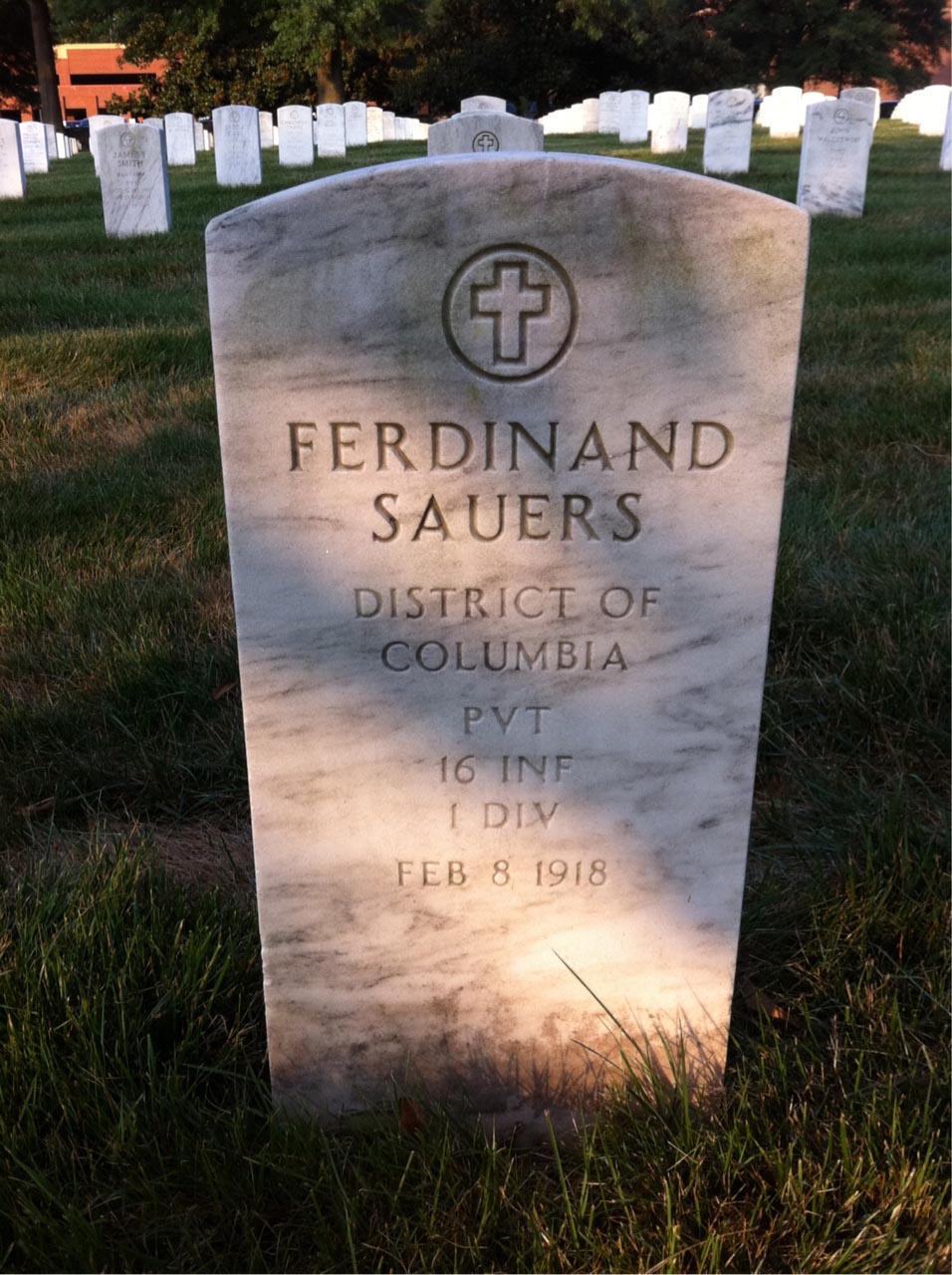 Ferdinand Sauers was born on September 13, 1895. Before enlisting in the National Guard in July 1917, Sauer had made two previous attempts to enlist in the navy. The first attempt was in 1915, but at that time he weighed only 110 pounds, was but 5 feet in height, and was rejected. In April, 1916, with several other Washington companions he tried to enter the navy at Baltimore; but was again refused. After the registration of June, 1917, he came back to Washington and told his father he had decided to enlist rather than be drafted, and accordingly enlisted in the District National Guard in July and a few months later he was on the firing line in France. He served in the U.S. Army during World War I as a Private in Company A, 16th Infantry Regiment, 1st Infantry Division. He was Killed in Action on February 8, 1918 at the age of 22 and is now buried in Arlington National Cemetery, Arlington, Arlington County, Virginia, USA.
