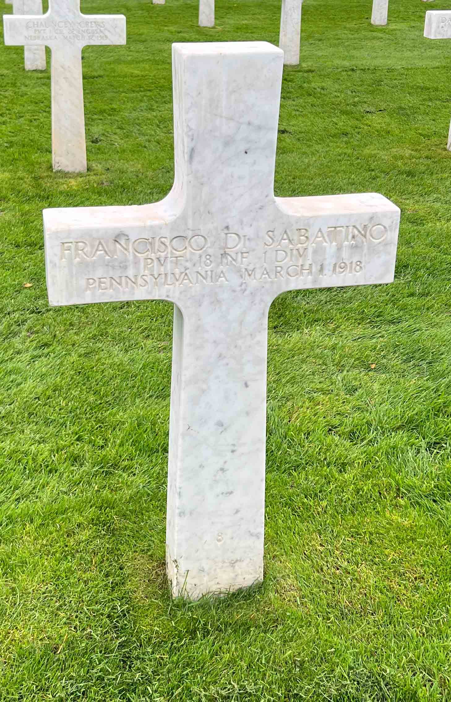 Francisco Di Sabatino entered the military service in Pennsylvania. He served in the U.S. Army during World War I as a Private in Company C, 18th Infantry Regiment, 1st Infantry Division. He was Killed in Action on March 1, 1918 and is now buried in St. Mihiel American Cemetery, Thiaucourt, France. His name is commemorated on the First Infantry Division monument in Vigneulles, France but his surname is inscribed as DiSobatine.