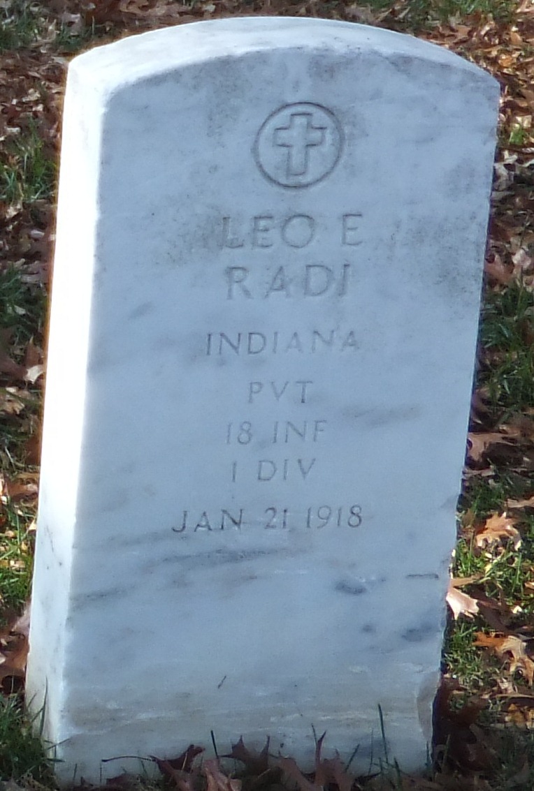 Leo E. Radi served in the U.S. Army during World War I as a Private in Company M, 18th Infantry Regiment, 1st Infantry Division. He was Killed in Action on January 21, 1918 and is now buried in Arlington National Cemetery, Arlington, Arlington County, Virginia, USA. His name is commemorated on the First Infantry Division monument in Vigneulles, France but his surname is inscribed as Raddie.