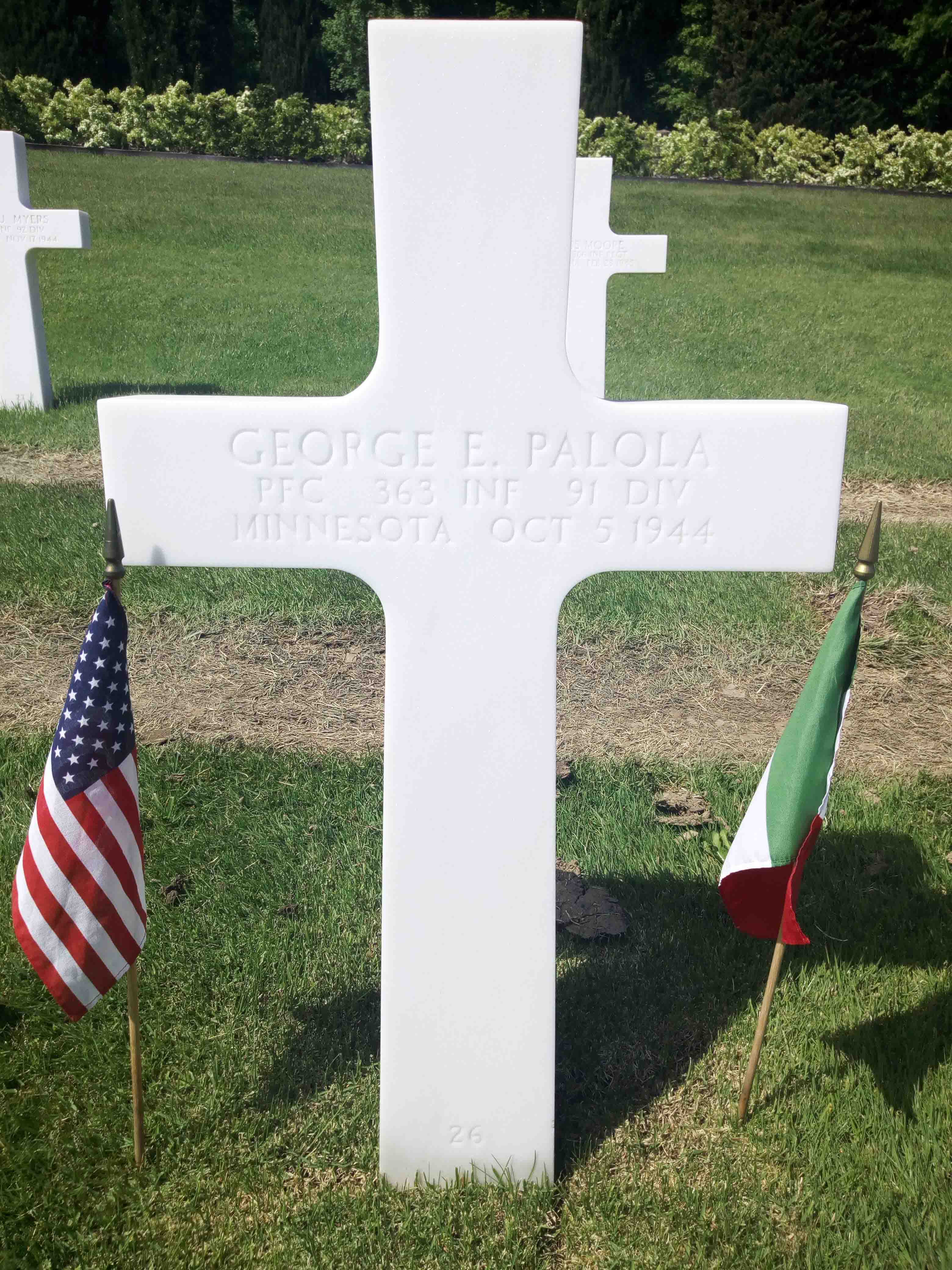 George E. Palola entered the military service in Minnesota. He served in the 363rd Infantry, 91st Infantry Division as a Private First Class during World War II. George died on October 5, 1944 during the battle in the area of Ponzalla, Italy and is now buried in the Florence American Cemetery, Impruneta, Italy.