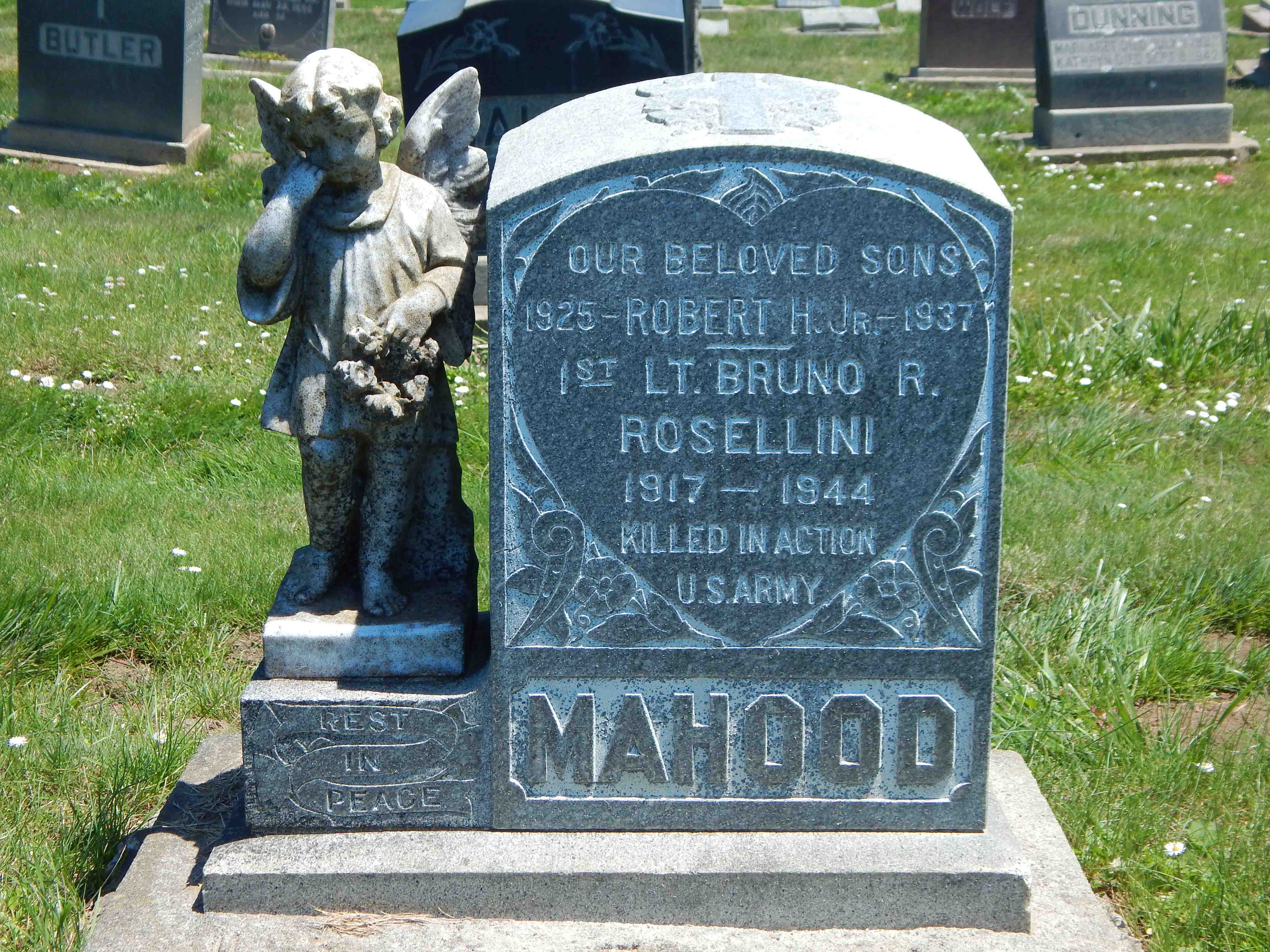 Bruno R. Rosellini, aged 26, was born on November 5, 1917 in San Francisco County, California. He was the son of Giovachinno Rosellini and Margaret Agnes Data Mahood. He served in the 363rd Infantry, 91st Infantry Division as a First Lieutenant during World War II. Bruno died on September 17, 1944 during the battle in the area of Ponzalla, Italy and is now buried in the Holy Cross Catholic Cemetery, Colma, San Mateo County, California, USA.