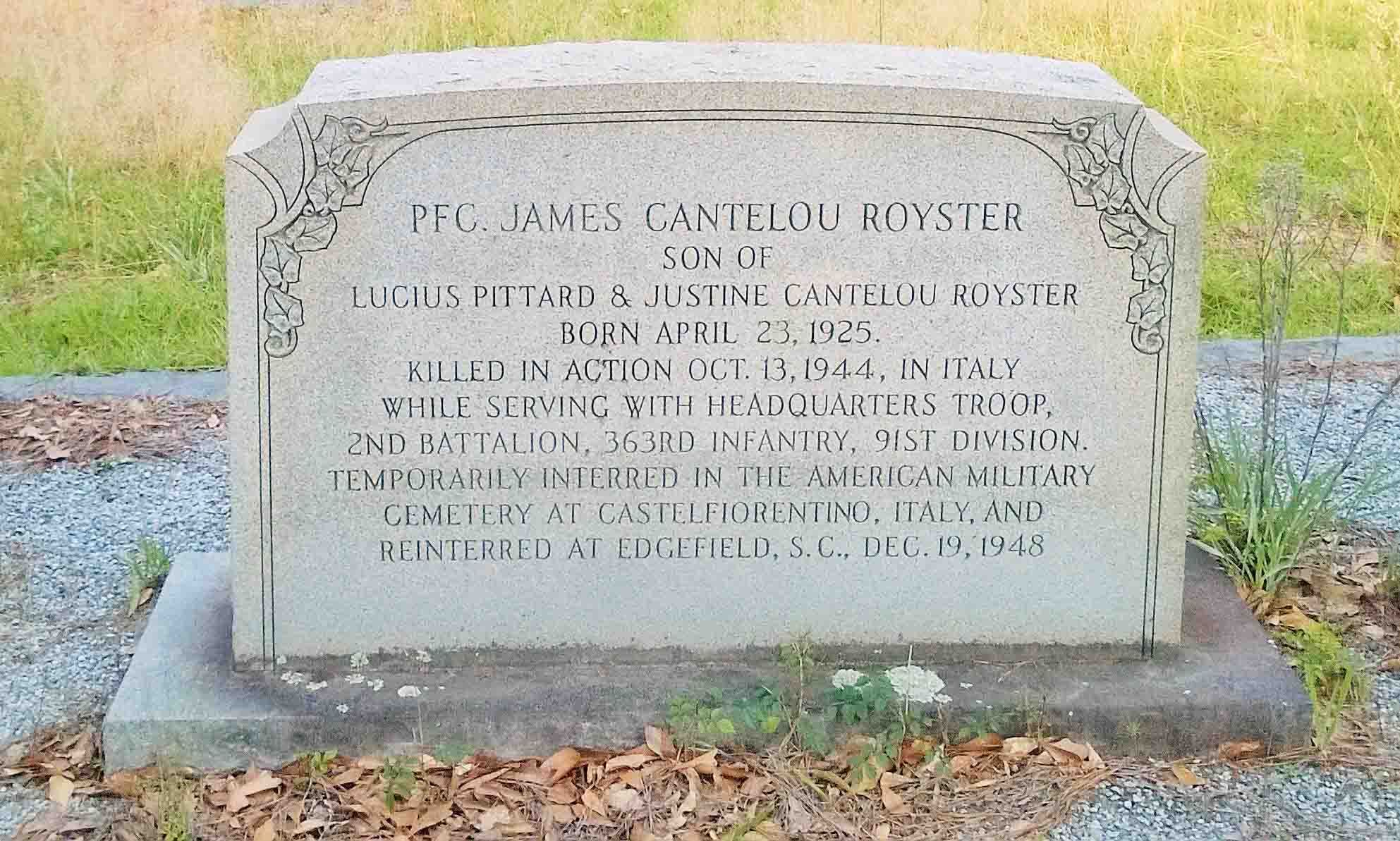 James Cantelou Royster, aged 19, was born on April 23, 1925 in South Carolina. He was the son of Lucius Pittard Royster and Justine Howell Cantelou Royster. He served in the 363rd Infantry, 91st Infantry Division as a Private First Class during World War II. James was Killed in Action on October 13, 1944 during the battle in the area of Ponzalla, Italy and is now buried in the East View Cemetery, Edgefield, Edgefield County, South Carolina, USA.