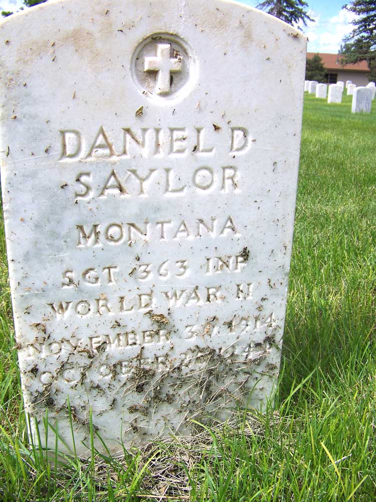 Daniel D. Saylor, aged 29, was born on November 30, 1914. He served in the 363rd Infantry Regiment, 91st Infantry Division as a Sergeant during World War II. Daniel died on October 20, 1944 during the battle in the area of Ponzalla, Italy and is now buried in the Custer National Cemetery, Crow Agency, Big Horn County, Montana, USA.