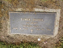 Elmer Snider, aged 23, was born on June 8, 1921. He enlisted in the Army on September 28, 1942 and served in the 363rd Infantry Regiment, 91st Infantry Division as a Private during World War II. He died from his wounds received in battle on September 13, 1944 in the area of Ponzalla, Italy and is now buried in the Brown Chapel Cemetery, Broseley, Butler County, Missouri, USA.