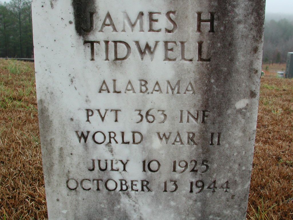 James Hillard Tidwell, aged 19, was born on July 10, 1925. He was the son of Robert Freeman Tidwell and Flora Adeline Kelly Tidwell. James served in the 363rd Infantry Regiment, 91st Infantry Division as a Private during World War II. He died on October 13, 1944 during the battle in the area of Ponzalla, Italy and is now buried in the Sardis #1 Missionary Baptist Church Cemetery, Lynn, Winston County, Alabama, USA.