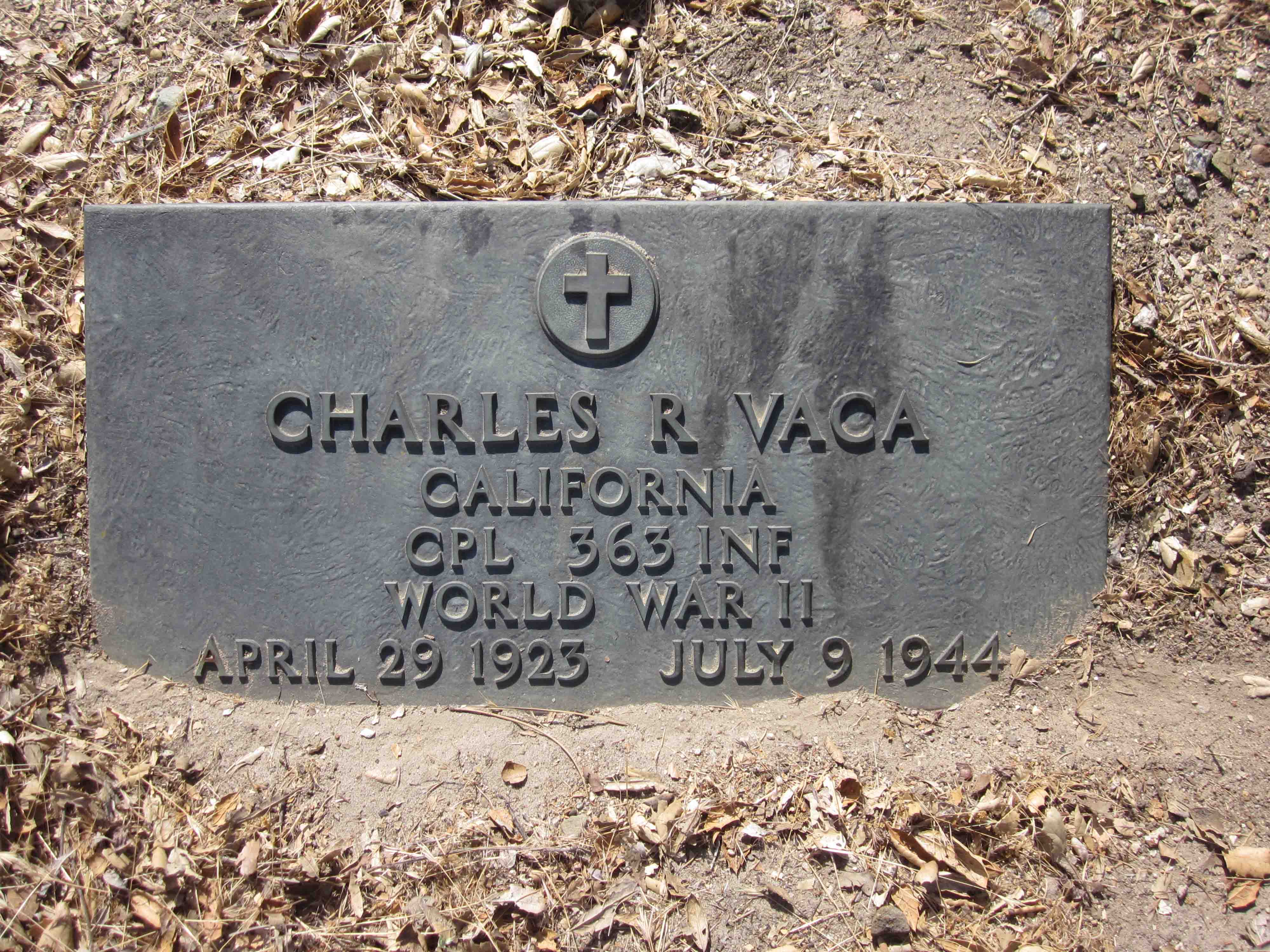 Charles R. Vaca, aged 21, was born on April 29, 1923. He served in the 363rd Infantry Regiment, 91st Infantry Division as a Corporal during World War II. He was Killed in Action on July 9, 1944 during the battle in the area of Ponzalla, Italy and is now buried in the Santa Margarita Cemetery, Santa Margarita, San Luis Obispo County, California, USA.