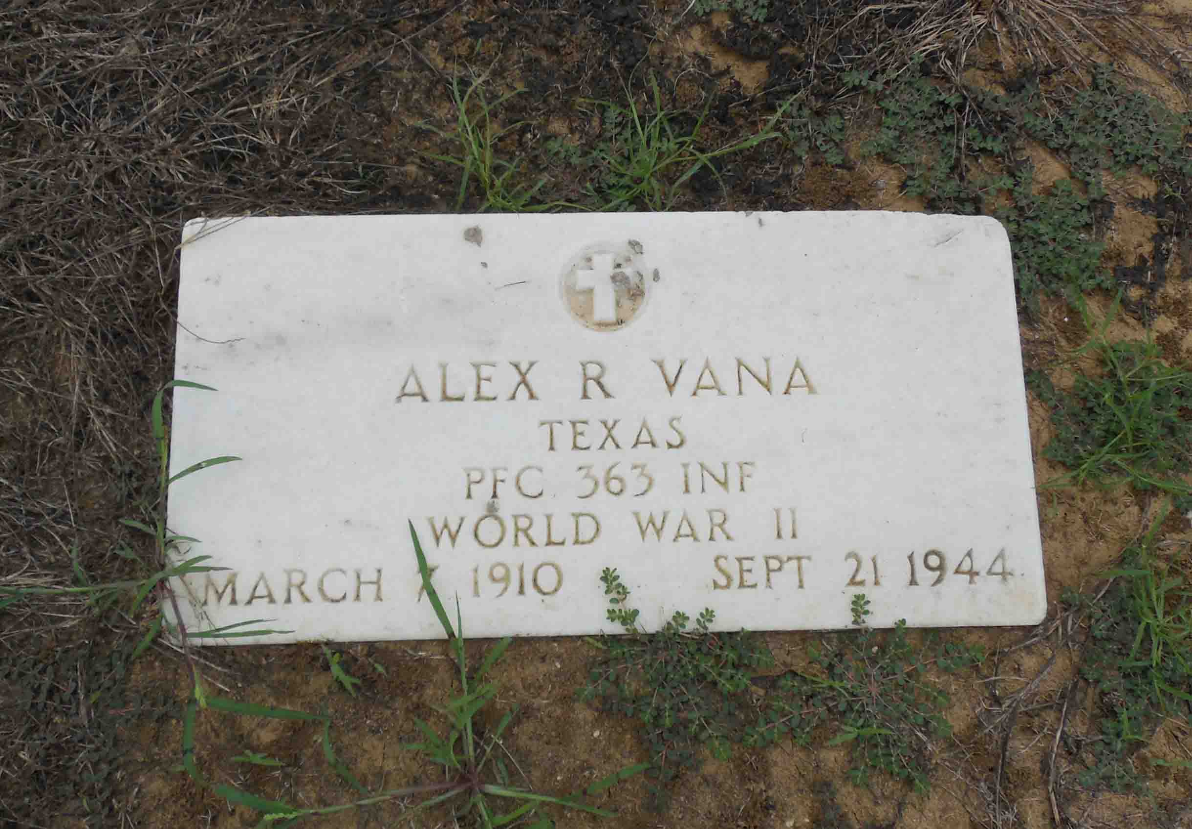 Alex Robert Vana, aged 34, was born on March 7, 1910 in Fayette County, Texas. He was the son of Conrad Bob Vana and Mary Ann Jalufka Vana. Alex served in the 363rd Infantry Regiment, 91st Infantry Division as a Private First Class during World War II. He died on September 21, 1944 during the battle in the area of Ponzalla, Italy and is now buried in the Sacred Heart Cemetery, Hallettsville, Lavaca County, Texas, USA.
