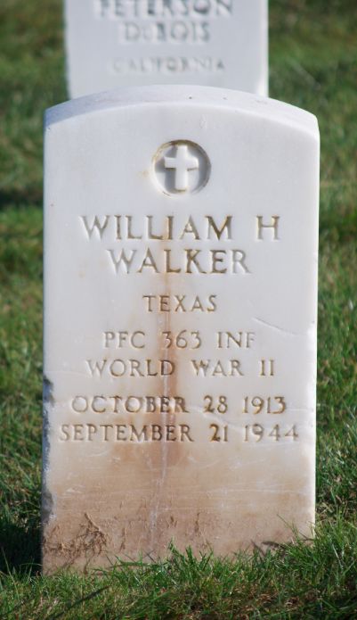 William H. Walker, aged 30, was born on October 28, 1913. He served in the 363rd Infantry Regiment, 91st Infantry Division as a Private First Class during World War II. William died on September 21, 1944 during the battle in the area of Ponzalla, Italy and is now buried in the Golden Gate National Cemetery, San Bruno, San Mateo County, California, USA.