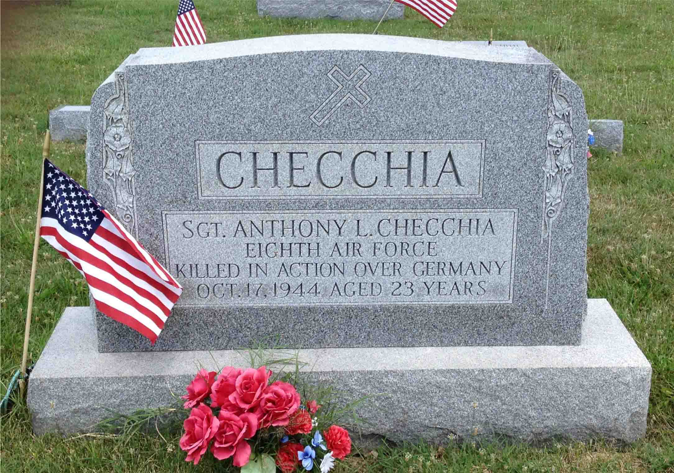 Anthony Checchia served in the 561st Bomber Squadron, 388th Bomber Group, Heavy as a Sergeant and ball turret gunner of an aircraft during World War II. He was Killed in Action on October 17, 1944 over Germany and is now buried in the Lawnside Cemetery, Woodstown, Salem County, New Jersey, USA. Sgt Checcia was one of the many brave Americans of the 388th Bomber Group who lost their lives in aerial operations against the German forces from June 1943 - August 1945.