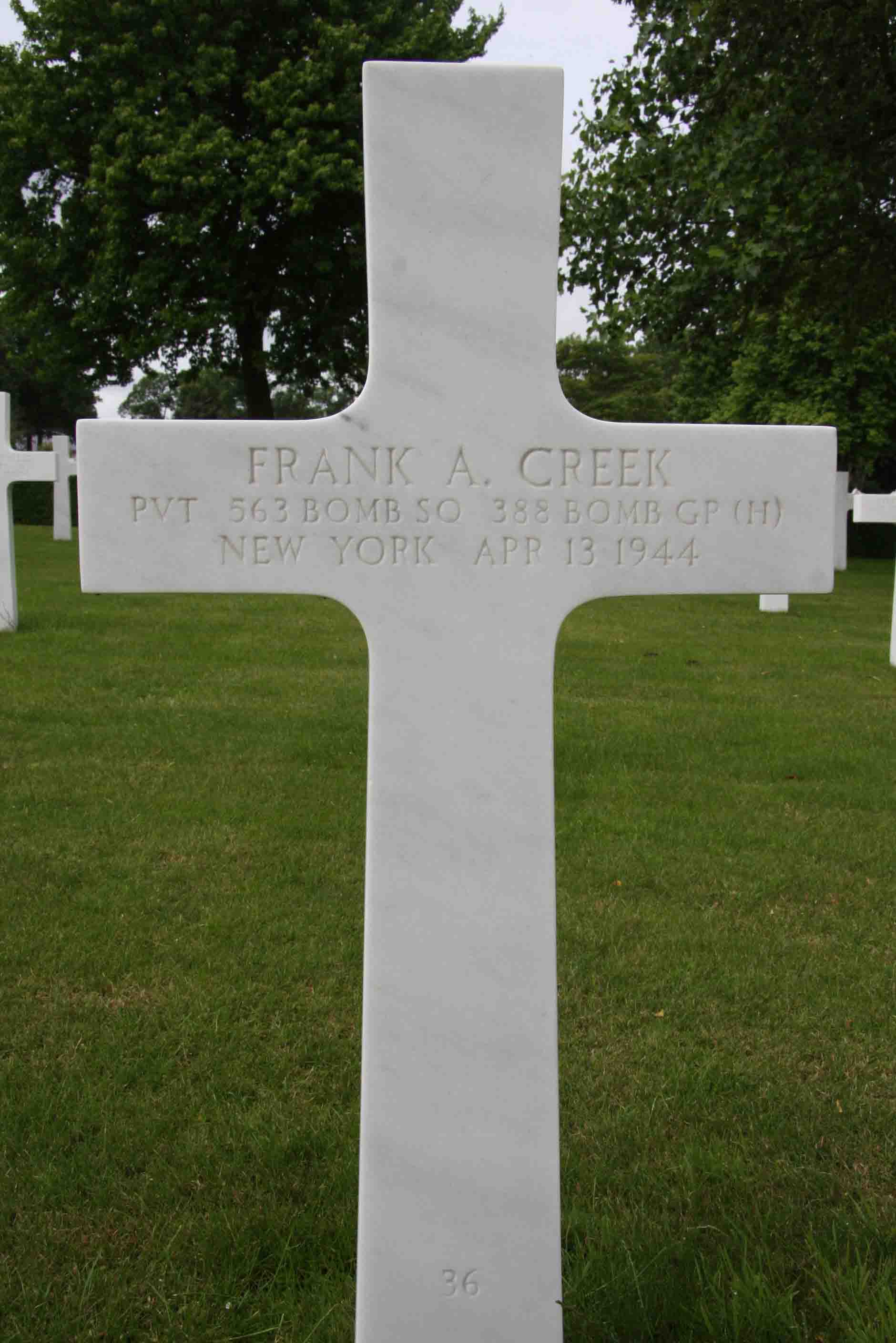Pvt Creek died in the "Line Of Duty" of a non-battle related incident in England during the war. He was one of the many brave Americans of the 388th Bomber Group who lost their lives in aerial operations against the German forces from June 1943 - August 1945.