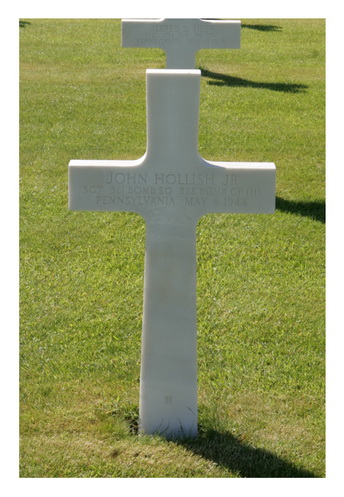 John W. Hollish, Jr. entered the military service in Pennsylvania. He served in the 561st Bomber Squadron, 388th Bomber Group, Heavy as a Sergeant and waist gunner of #42-107061 "Peg o' My Heart" aircraft during World War II. John was Killed in Action when their plane was shot down on the first pass of enemy fighters at 0955 hours when a 20mm shell exploded in the cockpit and the engineer was hit by a 30 caliber bullet. With #2 engine on fire, the crew bailed out and the plane crashed with a full bomb load south-east of Bremen. He is now buried in the Ardennes American Cemetery, Neupré, Belgium. He was one of the many brave Americans of the 388th Bomber Group who lost their lives in aerial operations against the German forces from June 1943 - August 1945.