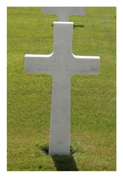 Edward D. Shaw was born in 1922 in Connecticut. He served in the 563rd Bomber Squadron, 388th Bomber Group (Heavy), as a Sergeant and Ball Turret Gunner of #42-31103 "Pegasus II" aircraft during World War II. A member of the WilsonL crew, he was killed when their plane crashed on March 23, 1944. The plane was attacked by enemy fighters, one of which collided with this aircraft knocking off a wing. This aircraft went down in a spin. Three chutes were seen to open, one of which was split. Sgt Shaw is now buried in the Ardennes American Cemetery, Neupré, Belgium. He also has a cenotaph located in Roxbury Cemetery, Stamford, Fairfield County, Connecticut. He was one of the many brave Americans of the 388th Bomber Group who lost their lives in aerial operations against the German forces from June 1943 - August 1945.