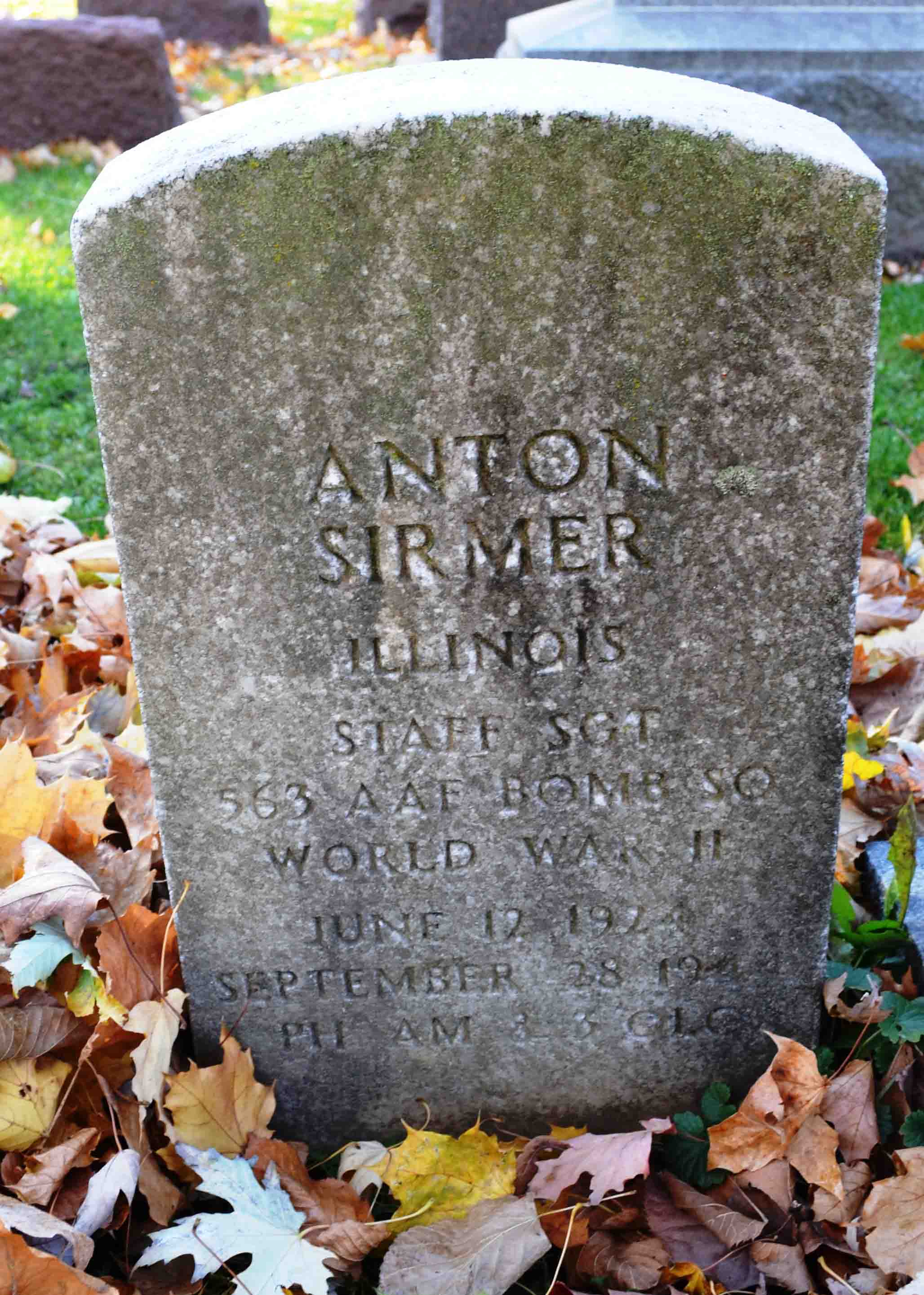 Anton "Tony" Sirmer was born on June 12, 1924. He served in the 563rd Bomber Squadron, 388th Bomber Group (Heavy), as a Staff Sergeant and waist gunner of #43-38404 aircraft during World War II. He was Killed in Action on September 28, 1944 and is now buried in the Bohemian National Cemetery, Chicago, Cook County, Illinois, USA. SSgt Sirmer was one of the many brave Americans of the 388th Bomber Group who lost their lives in aerial operations against the German forces from June 1943 - August 1945.