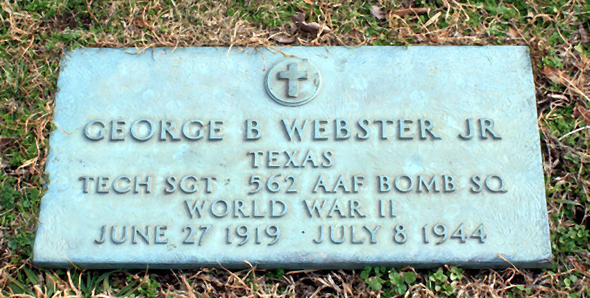 George Bailey Webster, Jr. was born on June 27, 1919 in Texas. He was residing in Texas, his native state, when he voluntarily enlisted on June 27, 1940. He had completed 2 years of college and had been employed as a laborer in a hatchery. He also was married. A member of the Fisher crew, he was killed when their plane was shot down on July 8, 1944. He is now buried in the Cedarlawn Memorial Park, Sherman, Grayson County, Texas, USA. TSgt Webster was one of the many brave Americans of the 388th Bomber Group who lost their lives in aerial operations against the German forces from June 1943 - August 1945.