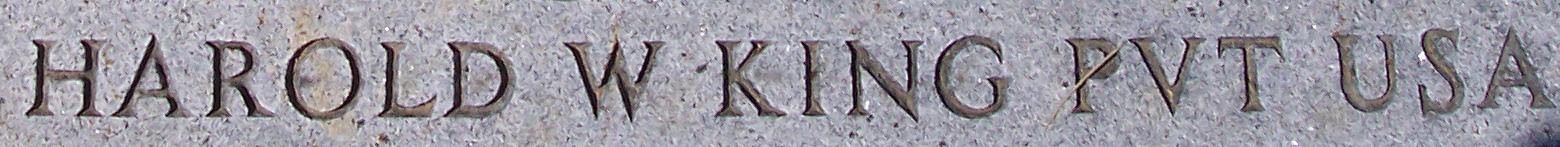 Harold Wayne King was born on January 27, 1910. He served in Battery D, 60th Coast Artillery Regiment (AntiAircraft), Coast Artillery Corps as a Private during World War II. An American prisoner of war, he was one of the Japanese massacre victims in Puerto Princesa, Palawan Philippines. In order to prevent the rescue of prisoners of war by the advancing Allies, on 14 December 1944, units of the Japanese Fourteenth Area Army (under the command of General Tomoyuki Yamashita) brought the POWs back to their own camp. An air raid warning was sounded to get the prisoners into the shelter trenches, the 150 prisoners of war at Puerto Princesa entered those trenches, and the Japanese soldiers set them on fire using barrels of gasoline. Prisoners who tried to escape the flames were shot down by machine gun fire. Others attempted to escape by climbing over a cliff that ran along one side of the trenches, but were later hunted down and killed. Only 11 men escaped the slaughter; 139 were killed. Those that did escape to southern Palawan, and eventual rescue, were aided by Filipino scouts and guerrillas under the command of Nazario Mayor. Of the victims, 123 are buried in a mass grave at Jefferson Barracks National Cemetery, St. Louis, Missouri, including Pvt King.