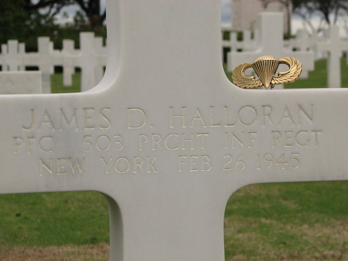 James D. Halloran entered the military service in New York. He served in the 503rd Parachute Infantry Regiment as a Private First Class during World War II. PFC Halloran died on February 26, 1945 and is now buried in the Manila American Cemetery, Taguig City, Philippines.