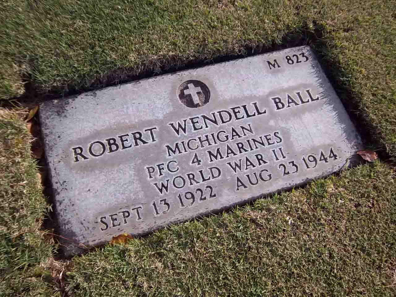 Robert Wendell Ball was born on September 13, 1922. He served in the Headquarters Company, 1st Battalion, 4th Marine Regiment, 1st Provisional Marine Brigade, as a Private First Class, during World War II. He was Killed in Action on August 23, 1944, during the Battle for Guam.